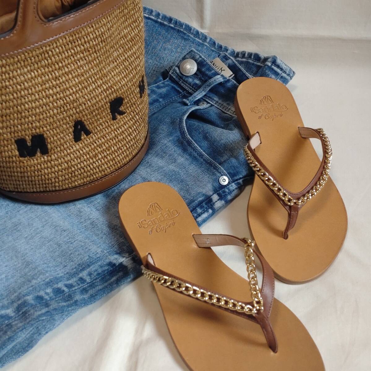 美しいシルエットのトングサンダルをベースに、ゴールドのチェーンをあしらったモード感漂う一足です。