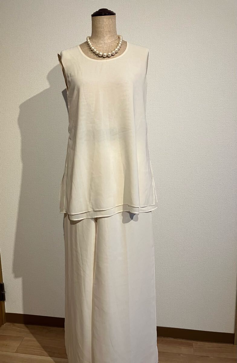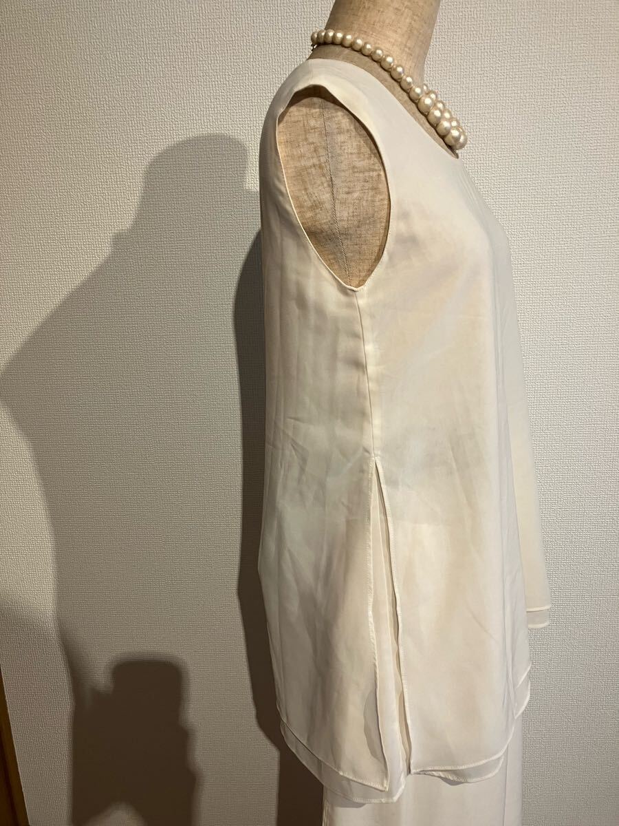 ノースリーブのフレアブラウスと、パンツは2枚仕立てで、サイドにスリットがありますので肌が直接見えません。