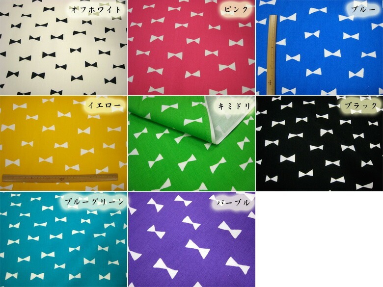 人気のリボン柄、当店でも取扱い開始です。シンプルな柄で様々なカラー、たくさん楽しめそうな人気の生地です。生地はやや薄手のオックス生地、インテリアや小物など色々な作品に使えます。