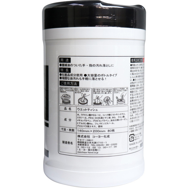 作業中の手の油汚れガッツリ落とす! 機械油で汚れた手に! 頑固な汚れはシートで落とす! ・機械修理・点検の際や車の整備時に。 ・工場はもちろん、ご家族でもご使用いただけます。 ・化粧品成分使用! ・大容量の80枚入でたくさん使える。 ・頑固な油汚れも手軽に落とせる。 個装サイズ:103X172X103mm 個装重量:約384g 内容量:80枚入 製造国:日本 【発売元:コーヨー化成】 【シートサイズ】 140mm×200mm 【成分】 水、ラウリン酸PEG-12、コハク酸ジエトキシエチル、エタノール、PEG-30水添ヒマシ油、BG、クエン酸、メチルパラベン、プロピルパラベン、加水分解コラーゲン、ヒアルロン酸Na、フェノキシエタノール、アロエベラ葉エキス、香料 【使用上の注意】 ・用途以外には使用しないでください。 ・本品をテーブルなどの上に長時間放置しないでください。 ・長年の使用によりコゲツキ、炭化した汚れ等は取れません。 ・水性ペンキやうるし、ニス塗装、白木、桐、畳、銅、しんちゅう製品などには使用しないでください。 ・直接、食品や食器、調理器具には使用しないでください。 ・アルコール過敏症の方や皮膚の弱い方がご使用した場合、また長時間ご使用した場合に手が荒れる恐れがありますのでご注意ください。 ・手荒れが気になる場合や長時間ご使用される場合は、ゴム手袋等をご使用ください。 ・液が目に入った場合はすぐ水で十分に洗い流してください。 ・水に溶けませんので、水洗トイレ等には流さないでください。 ・アルコールを含むため、火の近くでの使用及び保管は避けてください。 ・開封後はお早めにご使用ください。 ・高温になる場所、直射日光の当たる場所、乳幼児の手の届く場所には置かないでください。 ・使用後は乾燥を防ぐため、フタをしっかりしめてください。 ・ごみの分別にあたっては、自治体の区分にしたがってください。 注意事項 予告なく成分・パッケージが変更になることがございます。 予めご了承ください。 *予告なく成分・パッケージが変更になることがございます。予めご了承ください *ダンボールを使用して発送する場合には、入数以下の個数の場合、 中古ダンボールを使用する場合があり、ご注文の商品とは異なるダンボールになる場合があります。 あらかじめ、ご了承ください。 |