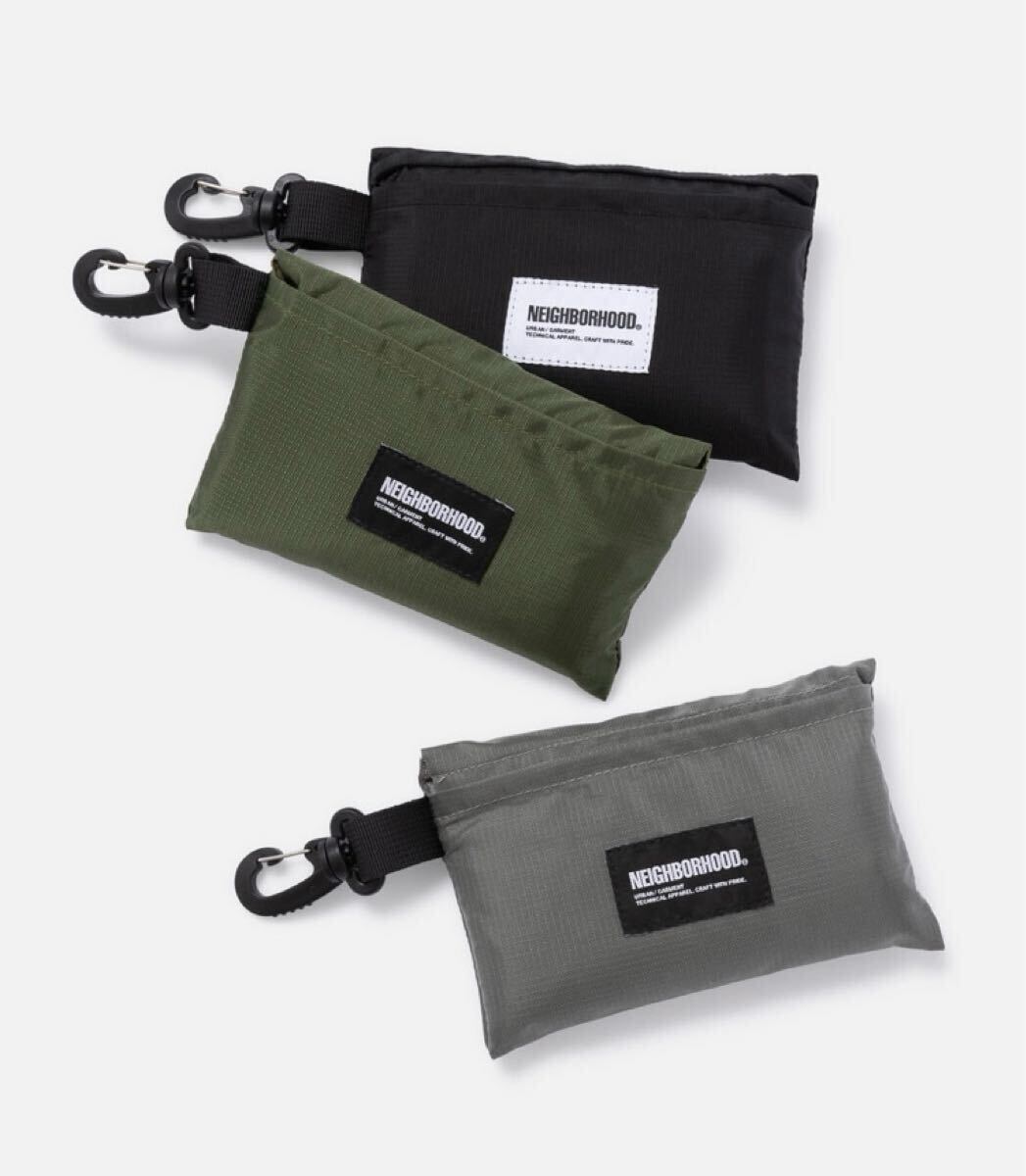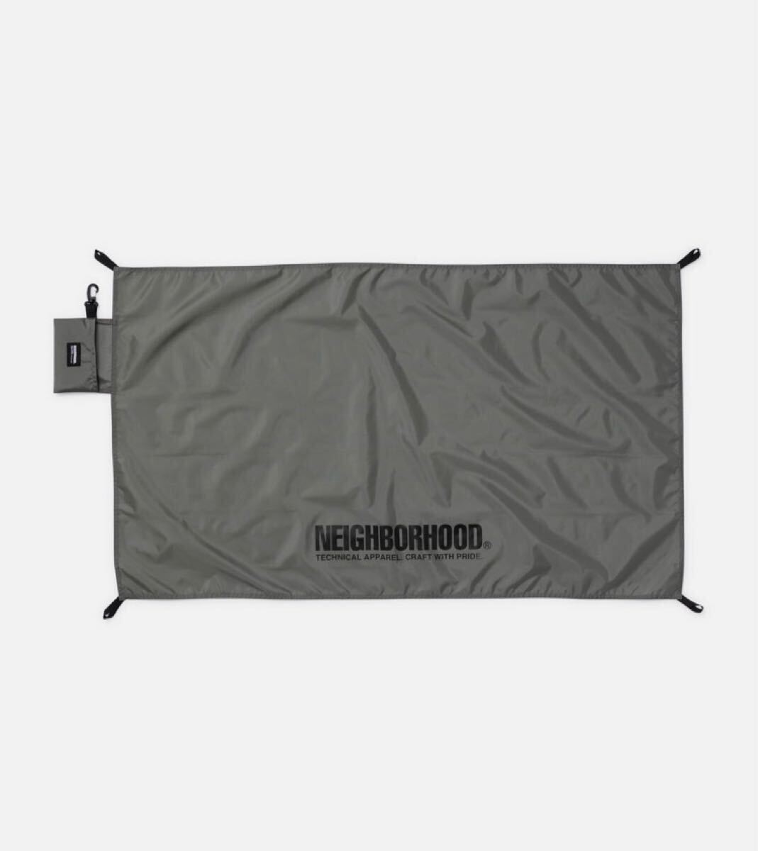 ロゴをプリントしたポリエステルリップストップ素材のピクニックシート。カラビナ付きのポケットにコンパクトに収納可能な仕様。