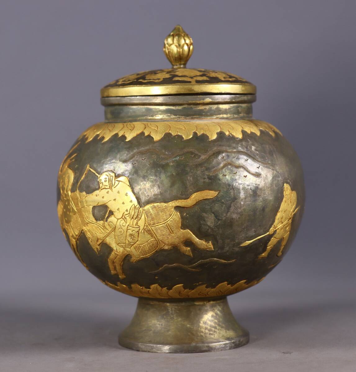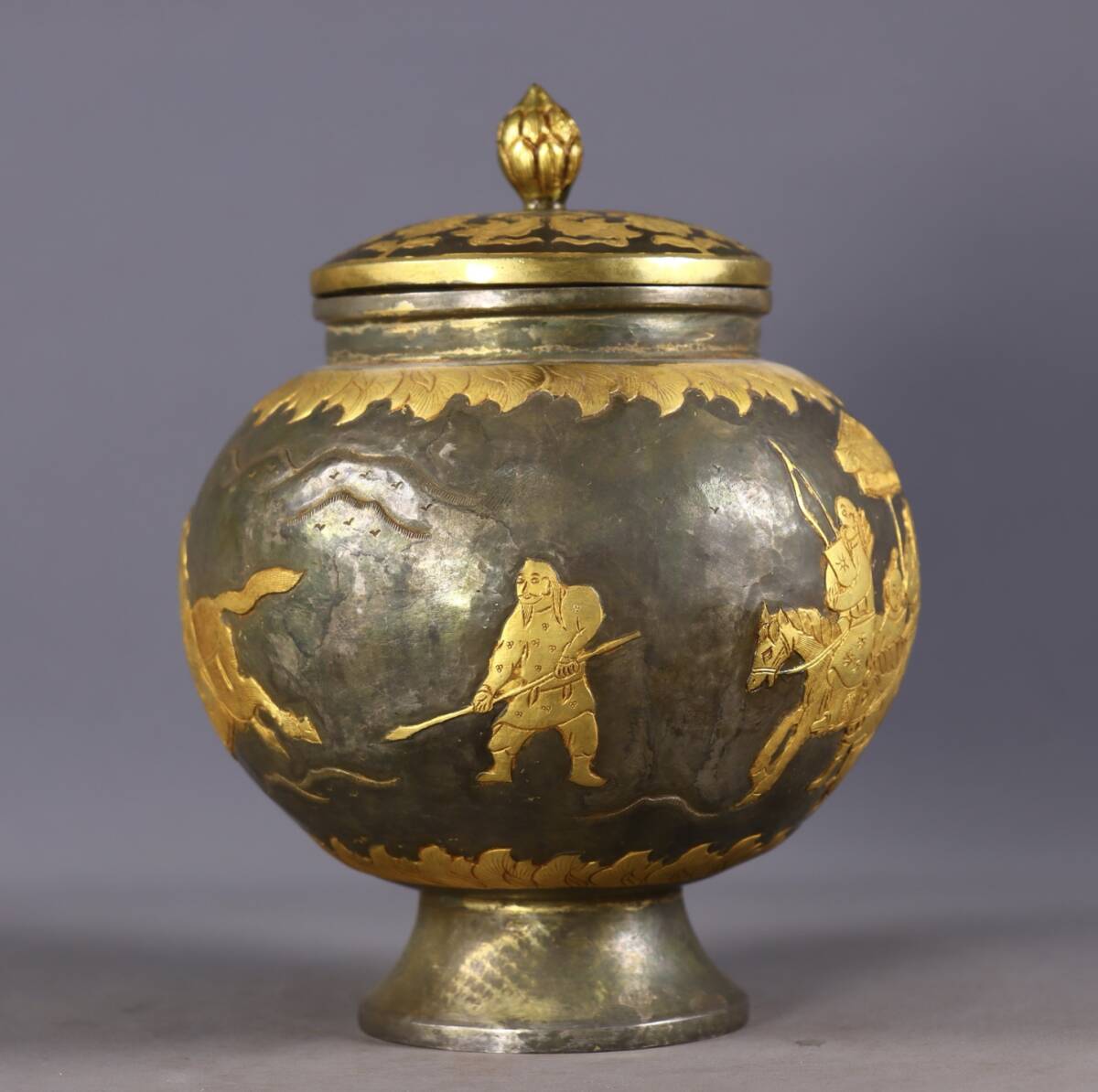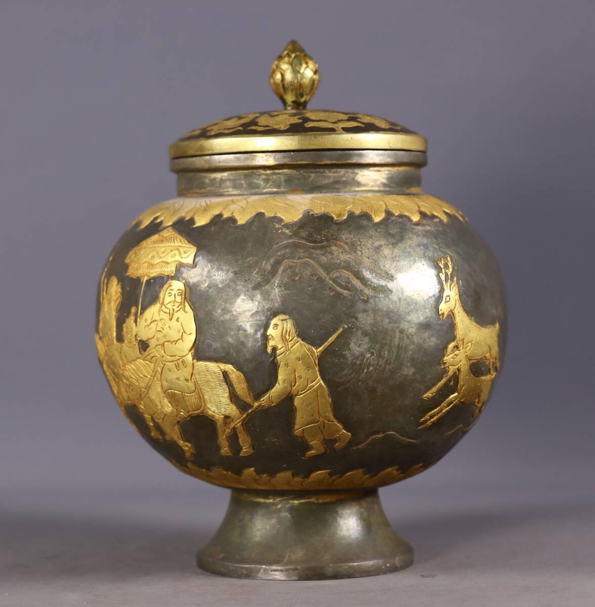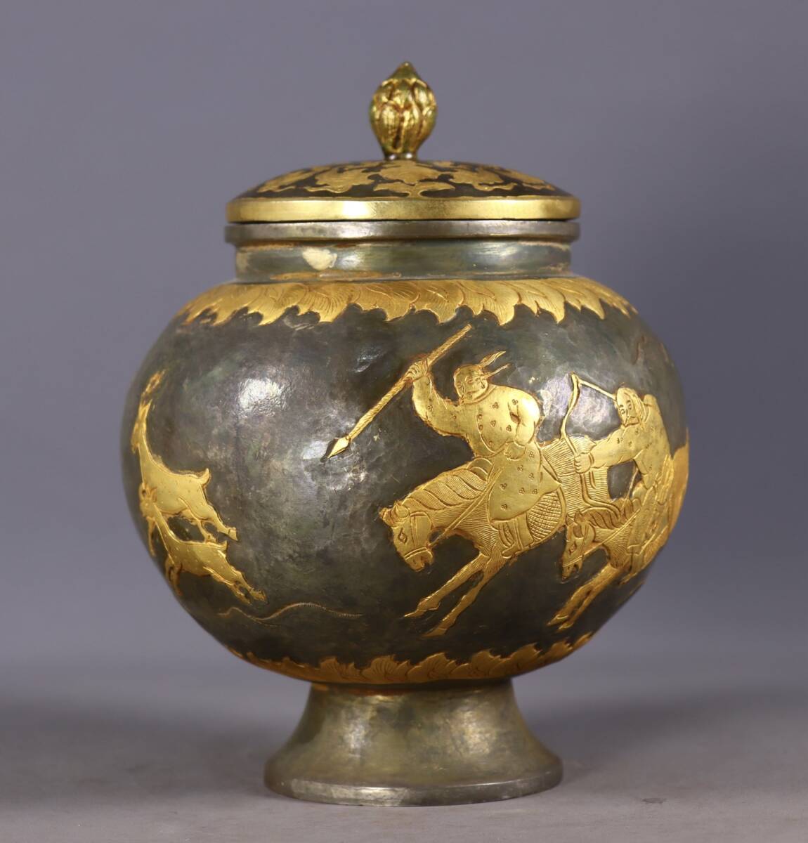 唐物 遼代時期 局部塗金 高浮彫 狩獵圖 罐 中国美術品 時代物 中国古玩 骨董品 D65