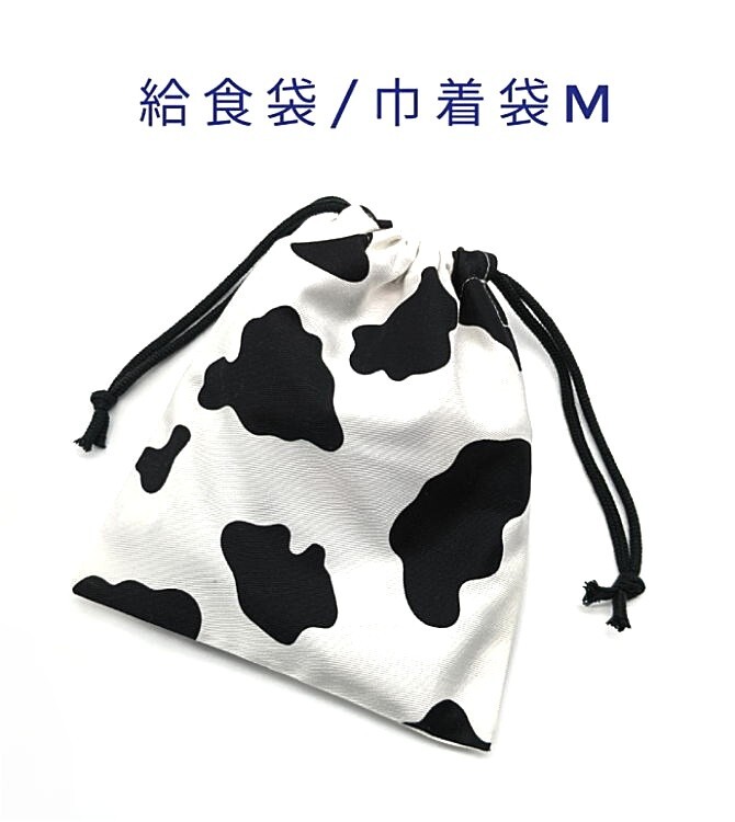 給食袋・巾着袋M【うし柄 ホワイト×ブラック】マチ無し 日本製 ランチ袋 ナフキン入れ ポーチ コップ袋 牛 丑 ウシ アニマル