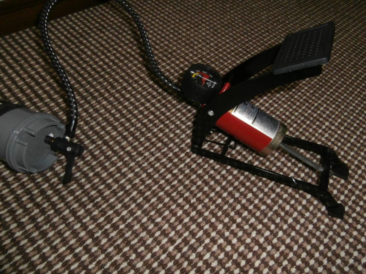 空気入れはご自分でご用意ください。気圧計の付いたものがホームセンターで千円程度で売っています。米国式バルブ対応のものが良いです。