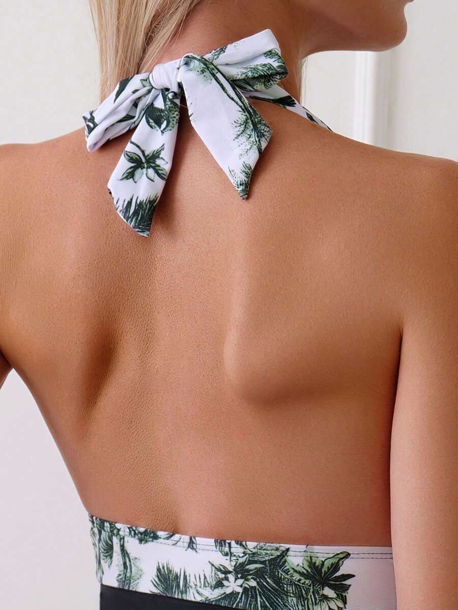 レディース 水着 ワンピース 熱帯風景プリント ホルター ワンピース水着