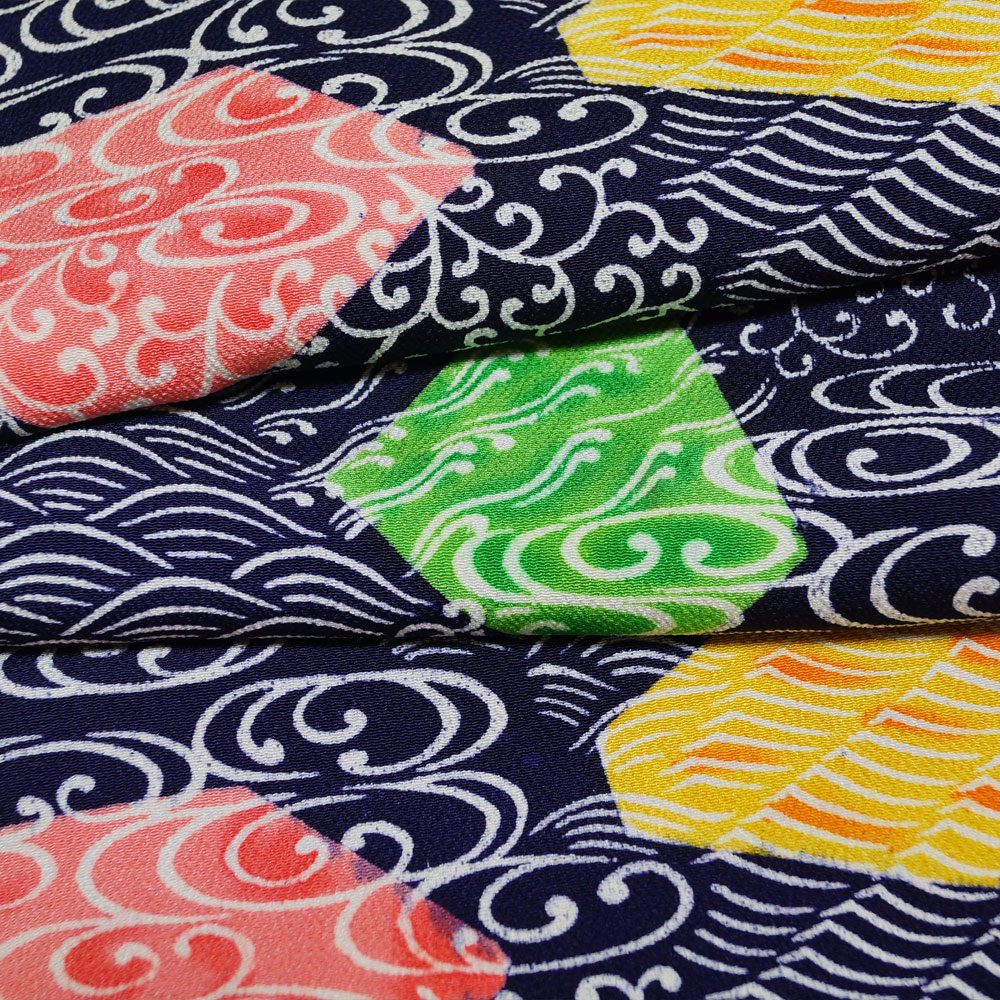 商品 説明 | 紺色系のちりめん地に取方に唐草や波頭模様が染められた小紋です。 |