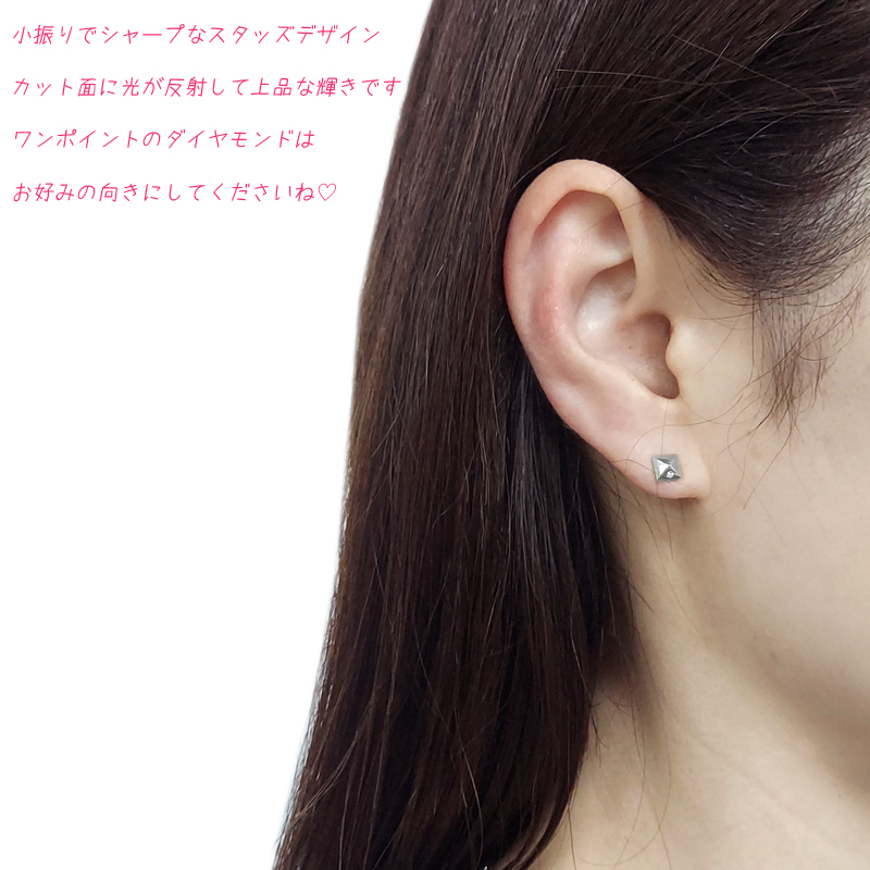 サイズ | ダイヤモンド カラット 0.01ct × 2個 スタッズ 約 5 × 5 mm / 厚み 約 2 mm ※ポスト:長さ 約 10.0 mm/太さ 約 0.6 mm(22G)です。 重量 約 0.4 g × 2個(キャッチ除く) |