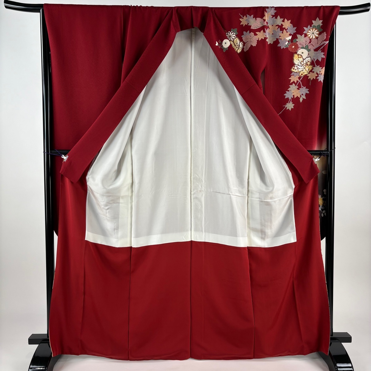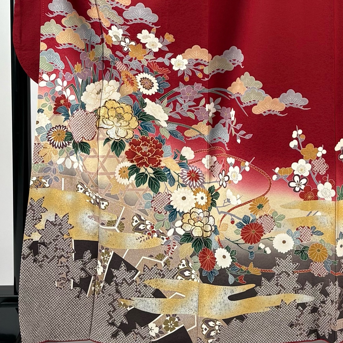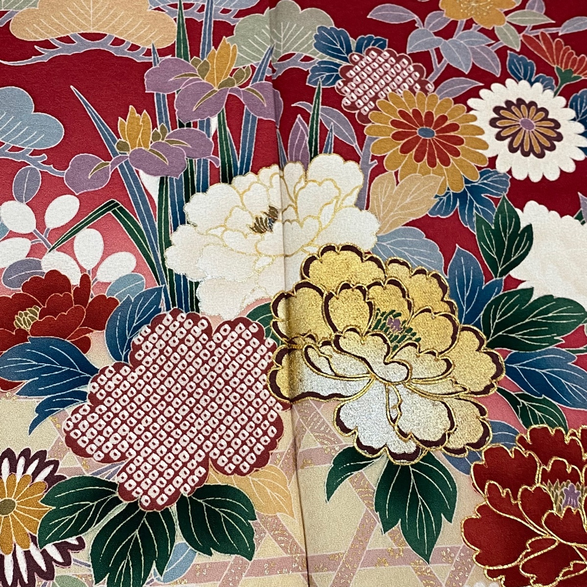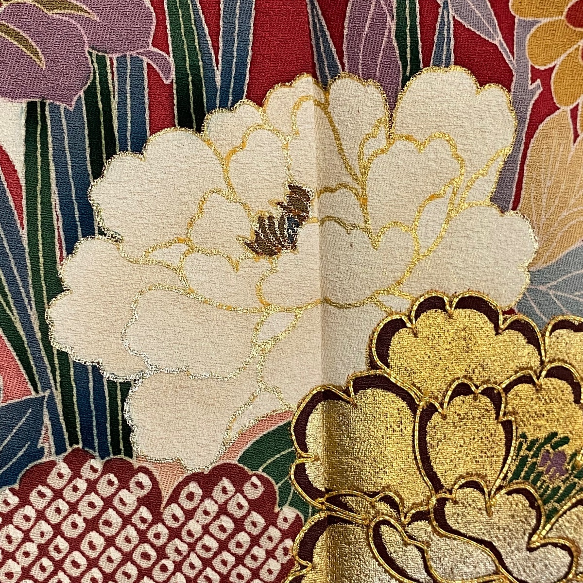 振袖 名品 牡丹 霞 金糸 金銀彩 赤 袷 身丈167 裄丈67 M 正絹 【中古】 |