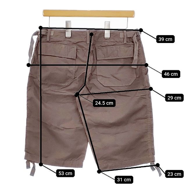 | 実寸サイズ | 総丈:約53cm ウエスト:約39cm ウエスト最短:約34cm 股上:約24.5cm 股下:約31cm ヒップ:約46cm ワタリ幅:約29cm 裾幅:約23cm ※記載以外のサイズが合わないことを理由とした返品はできませんので、 記載部分以外で実寸サイズの気になる箇所があれば必ず購入前にご質問ください。 |