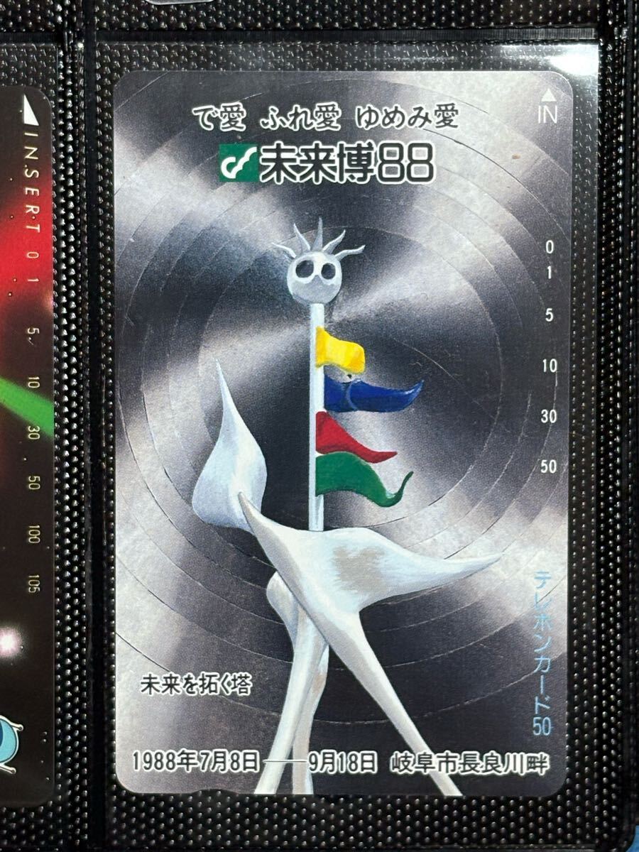 1988年に岐阜で開催された「ぎふ中部未来博’88」の公式記念テレホンカード、50度数仕様です。シンボルモニュメント「未来を拓く塔」(岡本太郎氏デザイン)をスタイリッシュに描いた、博覧会を象徴する一枚。レトロな博覧会グッズとして、また岡本太郎ファンにも訴求するアート性の高い希少なアイテムです。コレクターズアイテムやディスプレイにぜひおすすめいたします。