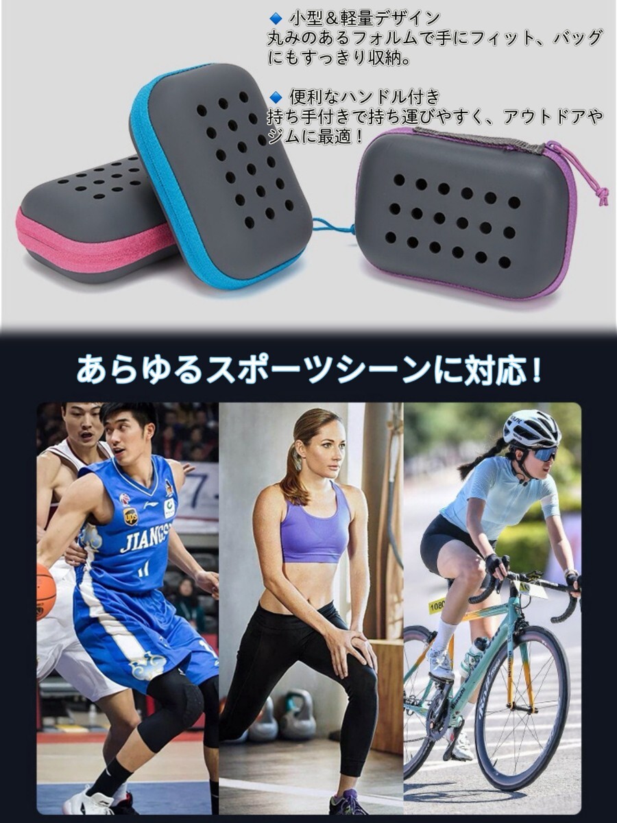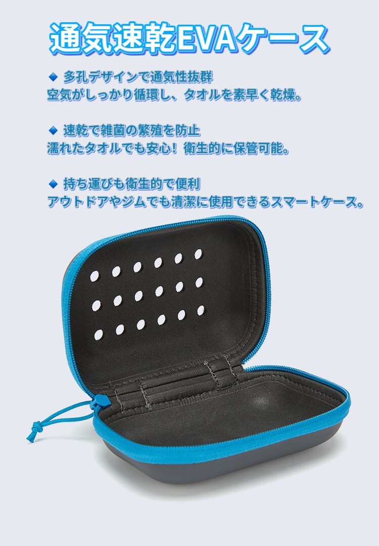 防水・防汚・衝撃に強いEVA素材を使用した専用ケース付き。通気穴設計で速乾&雑菌の繁殖を抑え、屋外や旅行にも便利。