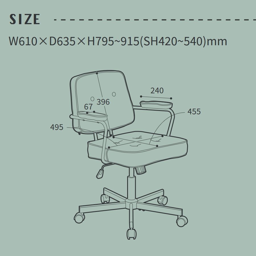 | ◆ サイズ | 幅61cm 奥行き63.5cm 高さ79.5-91.5cm 座面高42-54cm |