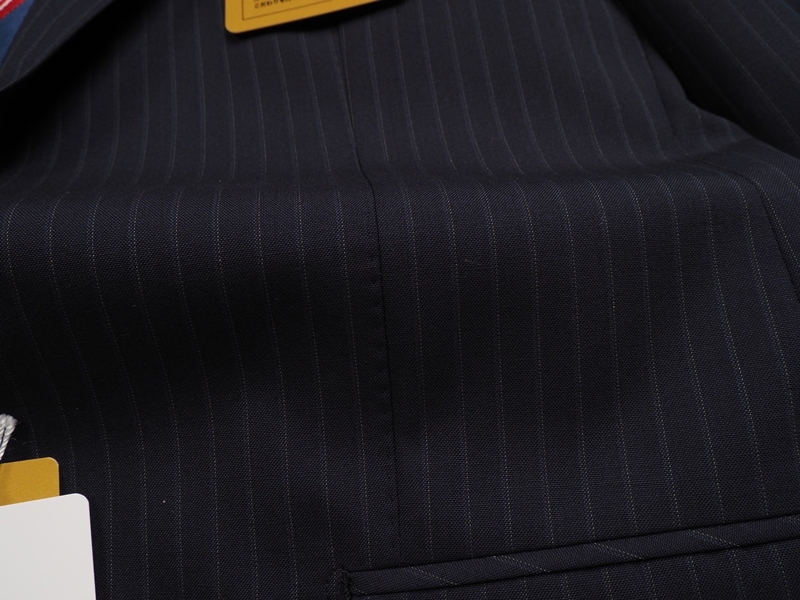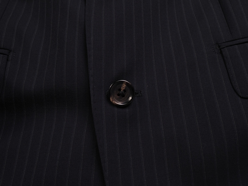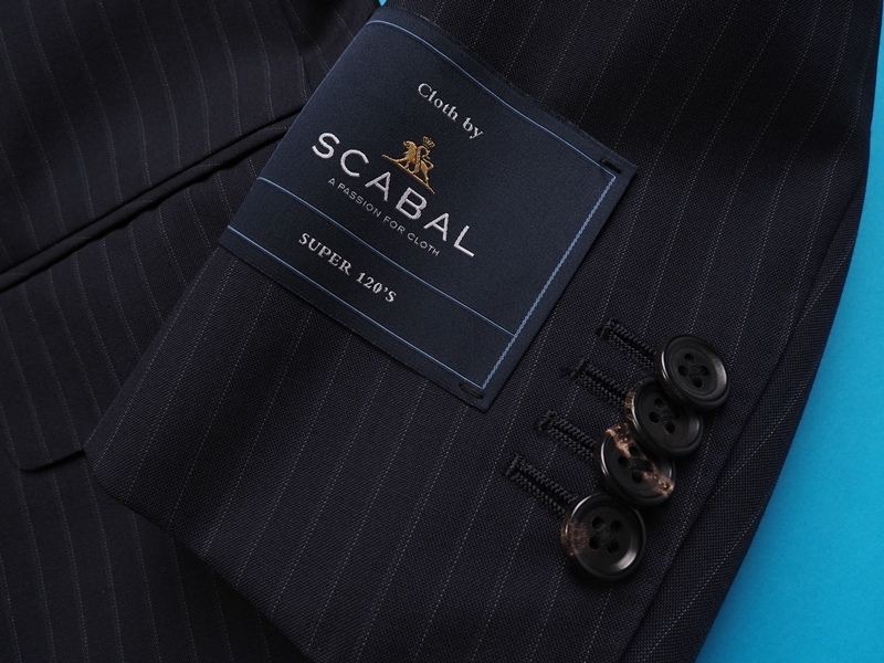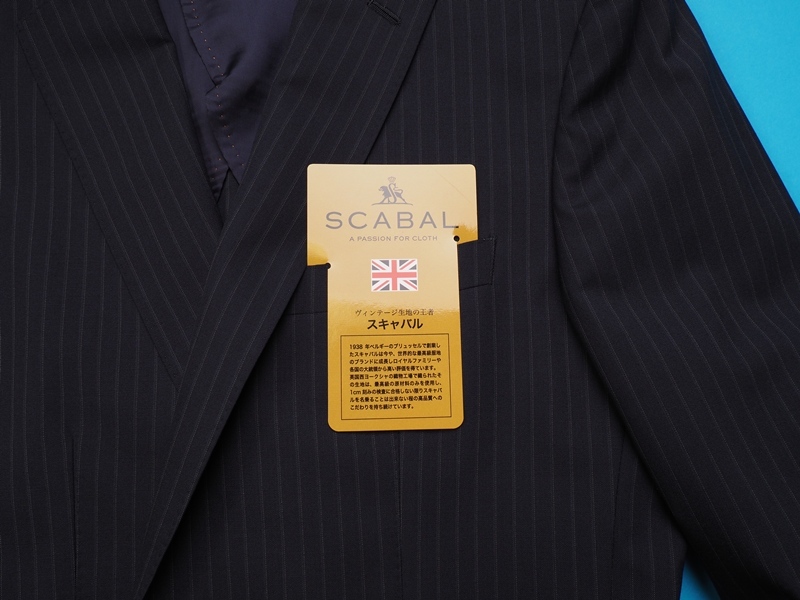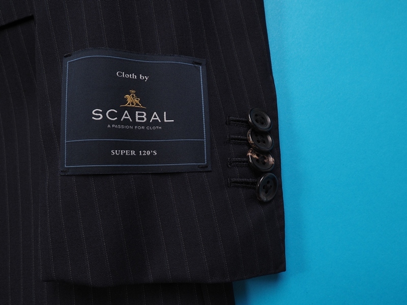 水牛釦、本切羽、お台場仕立て、AMFステッチ、ラペル毛芯など、百貨店向けならではの上級仕立てで仕上げられております。 ファブリックは英国製生地の中でも最高峰ランクで、「ビンテージ生地の王者」と言われるスキャバル社のSuper120'Sウール100%生地を使用。職人たちの手作業によって、織り上がった生地にペーパープレス仕上げを施すなど、生地の輝きや着心地の良さを高めるための努力を惜しまないことも、ヴィンテージ生地の王者と呼ばれる所以でしす。既製品では無く、オーダーメイドに供される最高級ランクの生地になります。