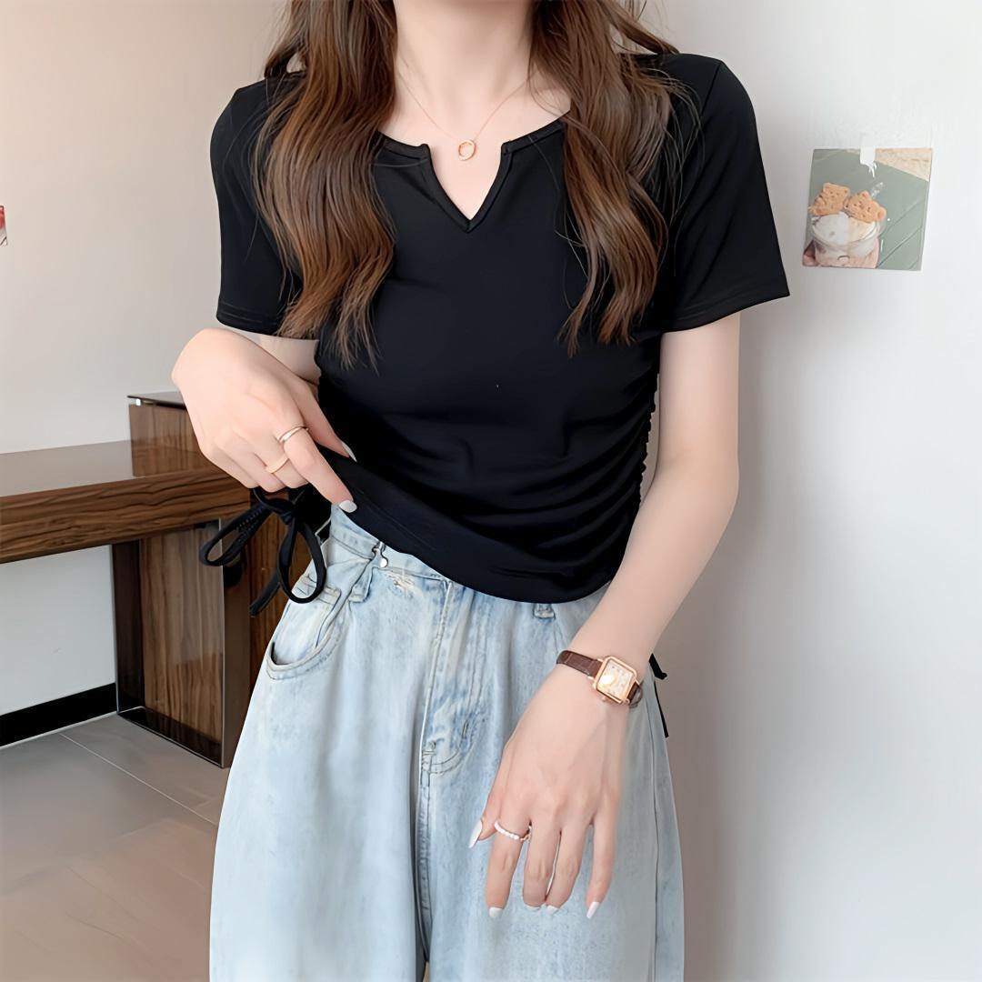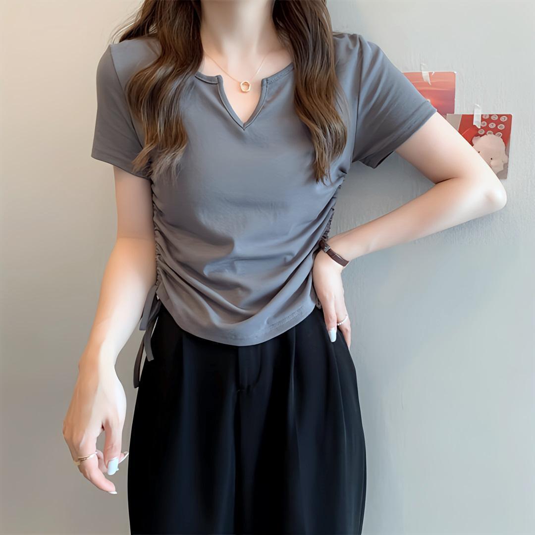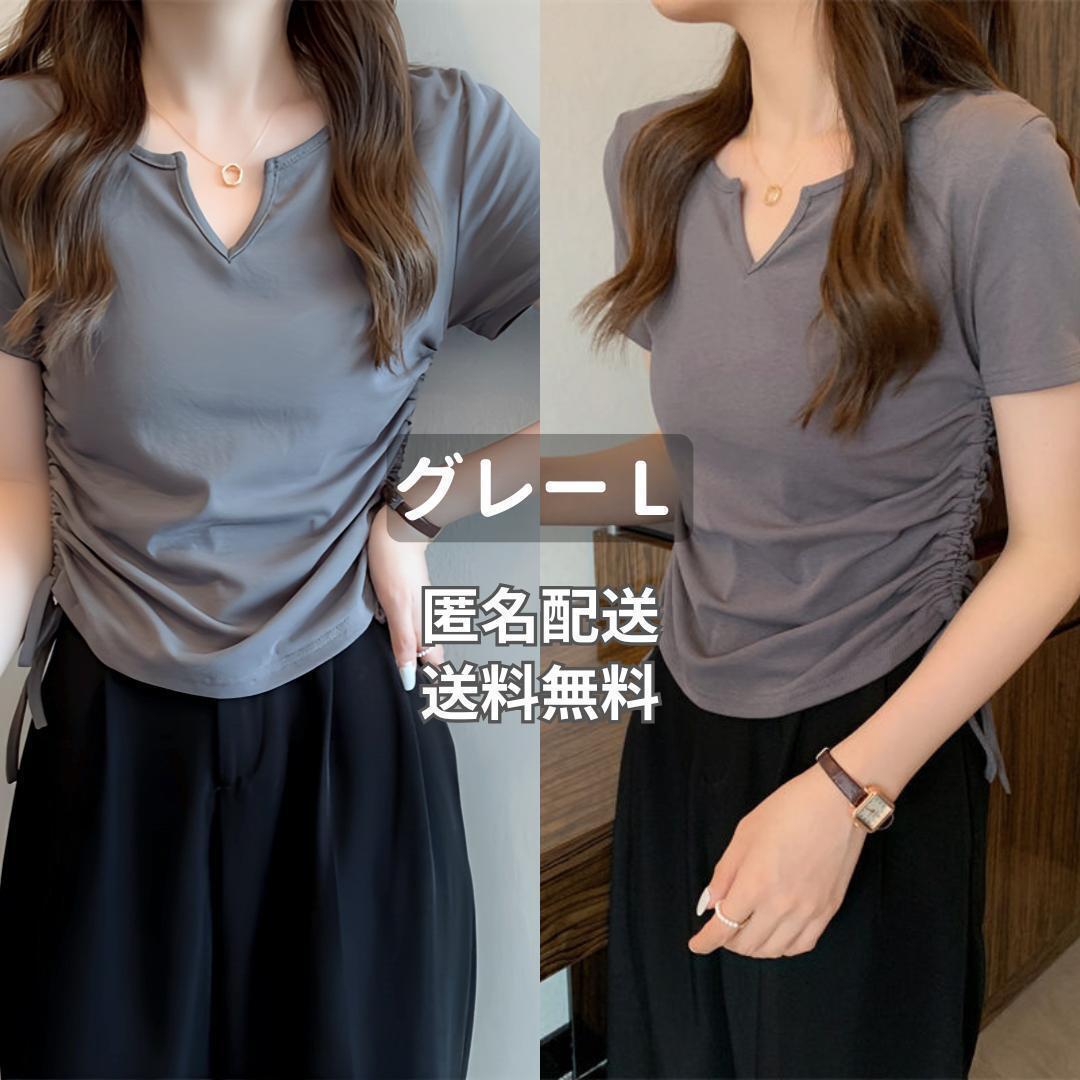 韓国風 ショート丈 ドロスト Tシャツ かわいい トップス グレー Lサイズ レディース カットソー 半袖