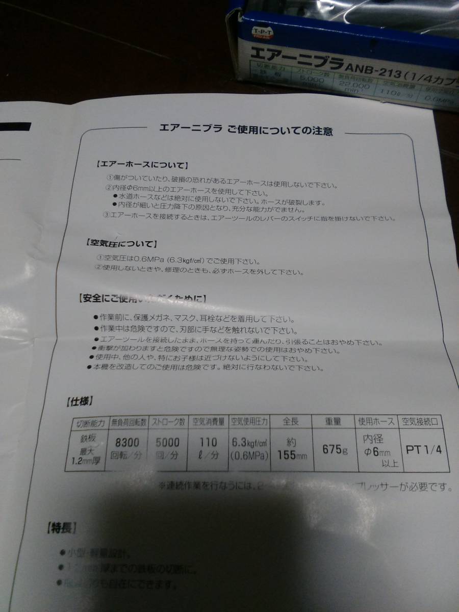 TPT・PRO-AIRエアーニブラ・ANB-213.新品未使用品パッケージ少し傷み有り。切断能力1.2mm(鉄板)・1/4カプラー付です。