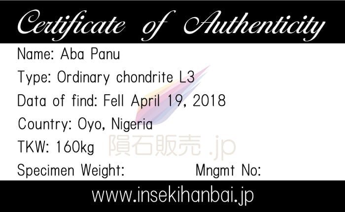 総既知重量160kgで、2018年4月19日の午後14時02分に複数の大きな火の玉がナイジェリアのオヨ州に落下しました。多くの隕石がイパポの村とテデの北側に落ちたため、隕石は複数の場所で集められました。隕石は落下点の中央近くにあるアバパヌの村にちなんで名付けられ、この村の中と周辺には複数のkg単位の隕石が見つかっています。Michael Farmer氏およびMoritz Karl氏が50kg、Eric Twelker氏が7.74kg、ASUが242g、その他はナイジェリア政府によって100kgほどが収集されたと推定されています。
