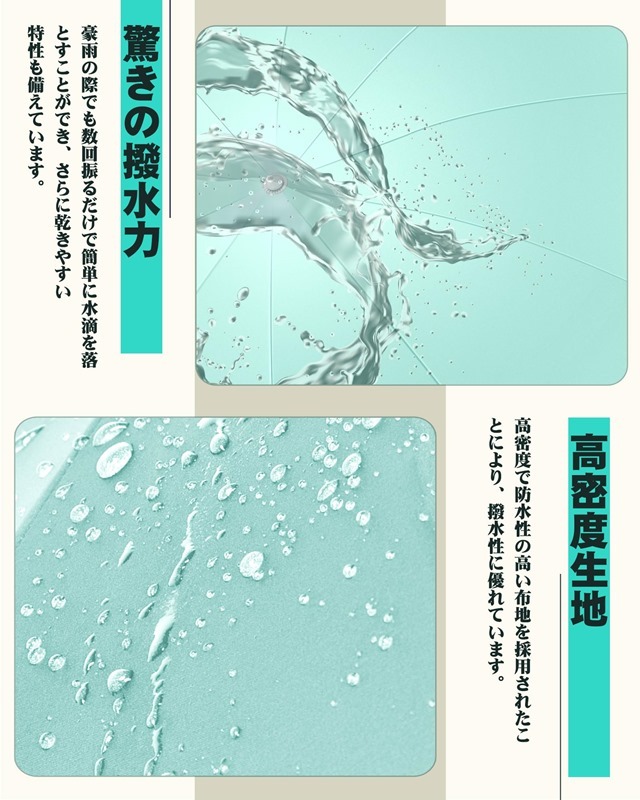 ●【高撥水力・晴雨兼用傘】当社の折り畳み傘 逆さ折式は高密度素材を使用し、かつ防水性の高いテフロン加工を施されたため、撥水性に優れ、豪雨の中でも体が濡れることは少ないです。生地に付着した雨水が染み込むことなくしっかりと弾いてくれるので、使用後軽く振るだけで水滴を振り払えます。折りたたみ傘 逆折りの裏側は日焼け止めの高密度コーティングを採用し、紫外線の通過を遮断し、日焼けから守り、暑い季節の通勤にも対応可能。