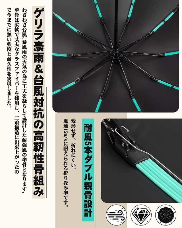●【10本骨・耐強風構造】この折りたたみ傘 逆折りはグラスファイバーとアルミ合金の二重傘骨を採用し、頑丈な構造を実現しています。柔軟性と強度を併せ持つ10本親骨、グラスファイバー120本骨(5+5+2)で組み立てられ、、耐風性と耐久性ともに向上させた、防食加工が施された 逆さ傘 のフレームは超強靭で錆びにくい上に、強風にあおられても豪雨に打たれても折れたり曲がったりしにくいです。3段折り構造により、強風で裏返ってもちゃんと元に戻ります。