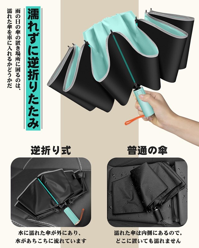 ●【逆折り式】逆向きに開閉するようにデザインされ、通常の傘と比べ、閉じたときに雨に濡れた部分が内側にたたまれるので、傘の雨水で服やカバンが濡れにくいです。特に満員電車やバスに乗っても周りの人に迷惑を掛けず、傘についた水滴が席につく心配はなく、濡れた傘のわずらわしさが解消され、とても便利な逆折り畳み傘です。