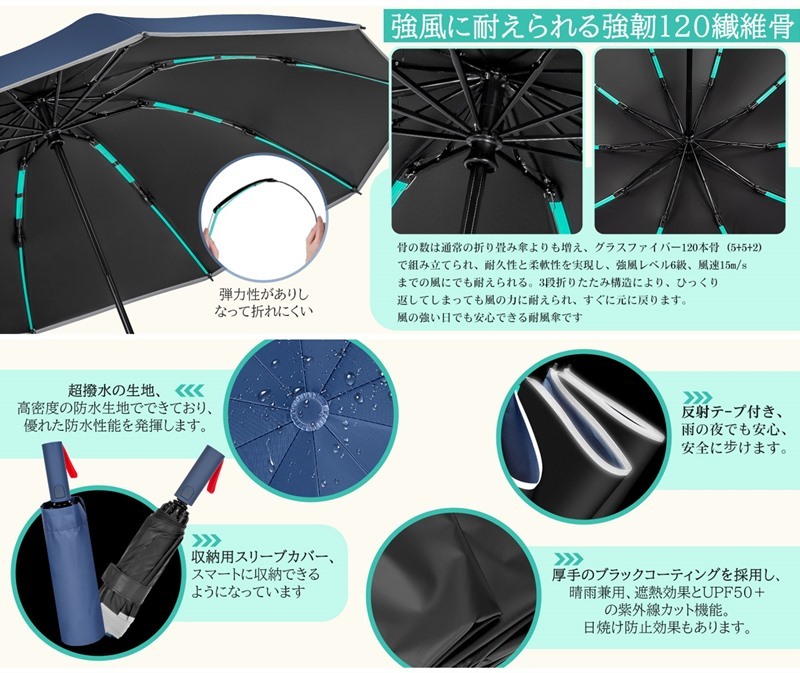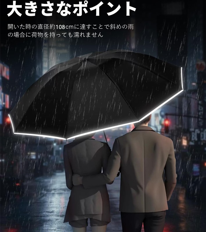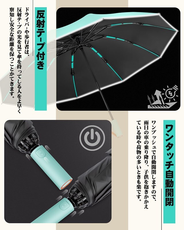 ●【ワンタッチ自動開閉・反射テープ付き】この逆さ折式 折り畳み傘は、片手がふさがっているときでも、ボタンをワンタッチするだけでかんたん簡単に素早く開閉できます。急な雨に見舞われたときや、車の乗降時など、さまざまな場面で便利です。逆折れ傘が反射テープ付きて、歩行者や使用者を夜間でも目立たせ、夜間の安心感を高めます。