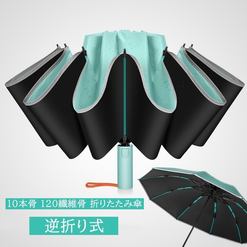 折りたたみ傘 逆さ傘 日傘 自動開閉 大きい 反射テープ 晴雨兼用 頑丈 超撥水 10本骨 台風対応 梅雨対策 車載傘 男性 男女兼用/グリーン