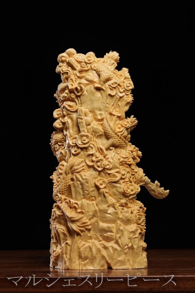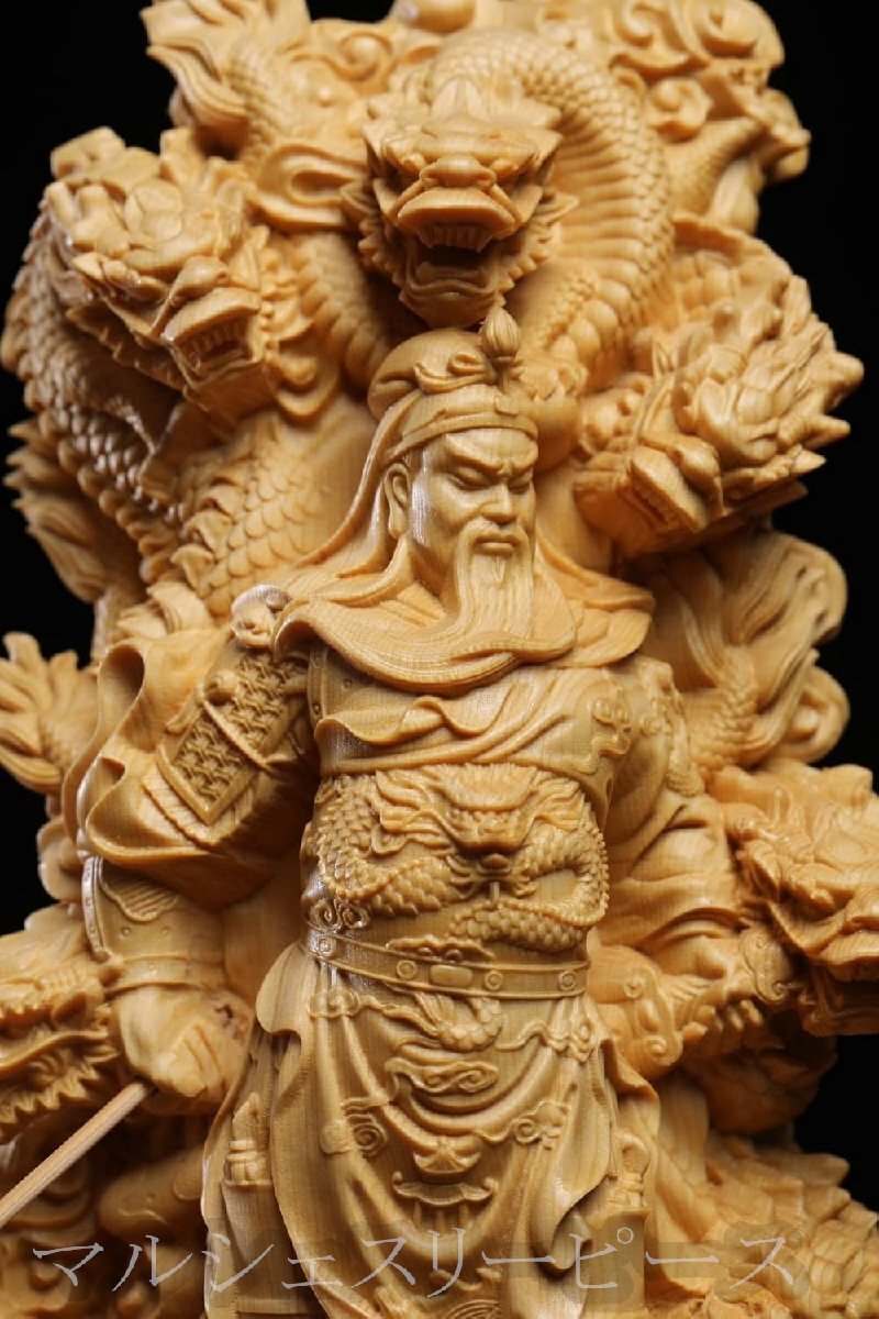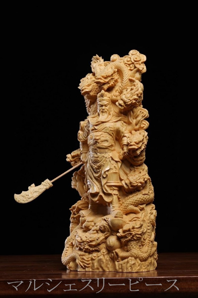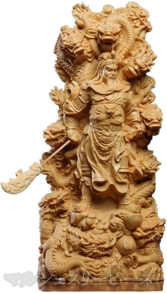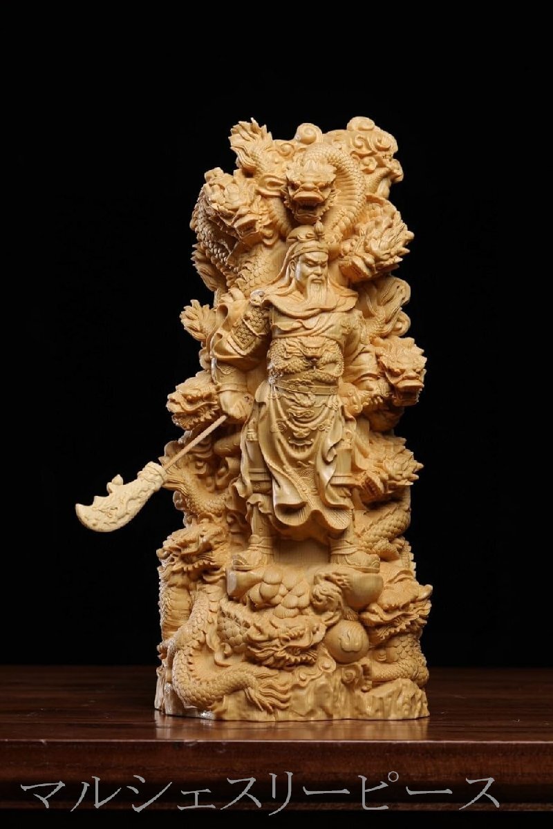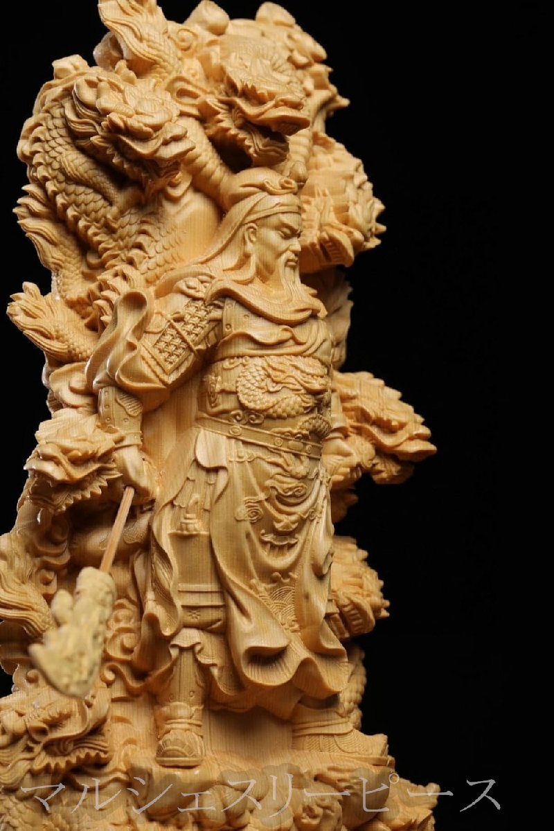 精緻な彫刻技術:熟練した職人が手作業で丁寧に彫り上げたこの置物は、細部まで精巧に作り込まれています。関羽の表情や、青龍偃月刀のデザインなど、その緻密な彫刻技術により、生き生きとした存在感を表現しています。
