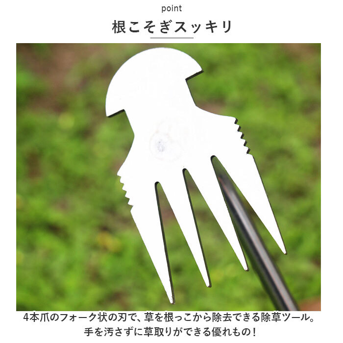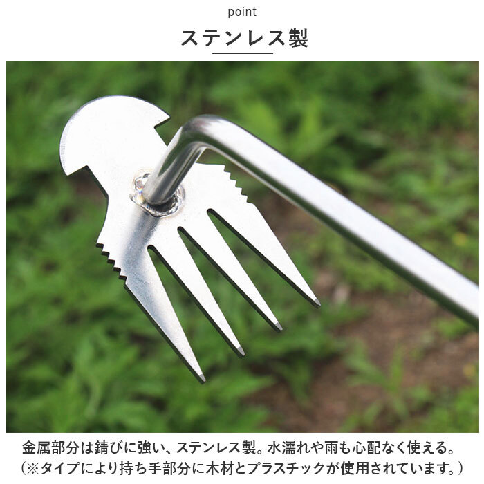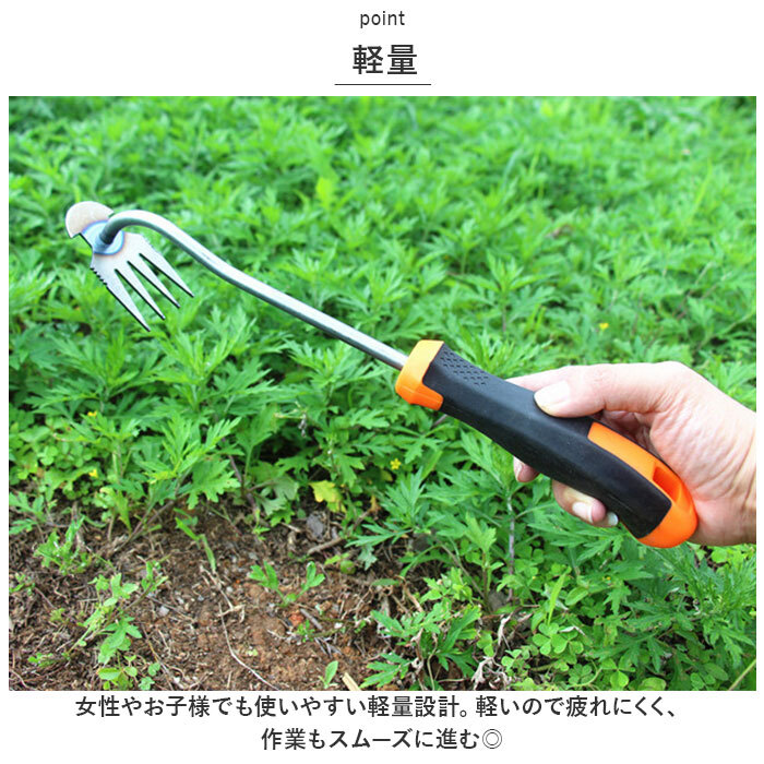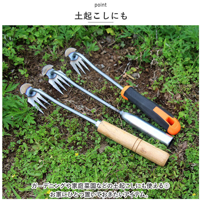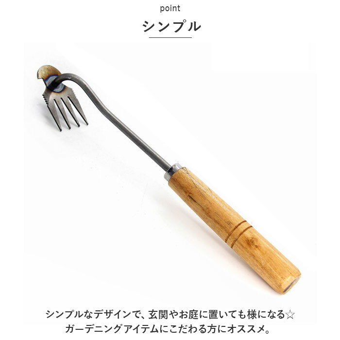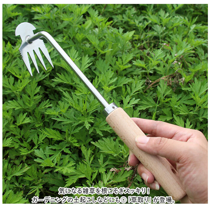 | 商品説明 | ・・気になる雑草を根こそぎスッキリ!ガーデニングの土起こしなどにも◎「草取り」が登場。 ・【根こそぎスッキリ】 ・4本爪のフォーク状の刃で、草を根っこから除去できる除草ツール。手を汚さずに草取りができる優れもの! ・【土起こしにも】 ・ガーデニングや家庭菜園などの土起こしにも使える◎お家にひとつ置いておきたいアイテム。 ・【軽量】 ・女性やお子様でも使いやすい軽量設計。軽いので疲れにくく、作業もスムーズに進む◎ ・【シンプル】 ・シンプルなデザインで、玄関やお庭に置いても様になる☆ガーデニングアイテムにこだわる方にオススメ。 ・【ステンレス製】 ・金属部分は錆びに強い、ステンレス製。水濡れや雨も心配なく使える。 ・(※タイプにより持ち手部分に木材とプラスチックが使用されています。) |