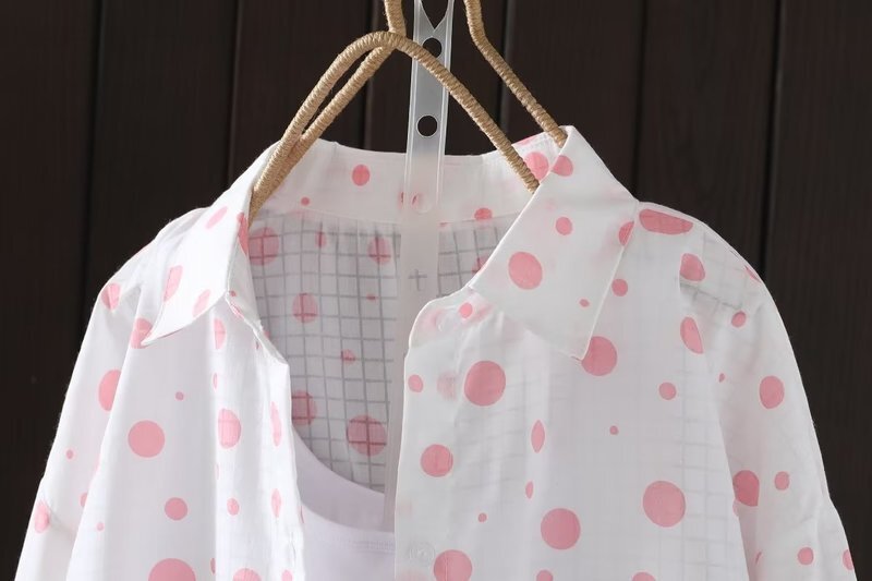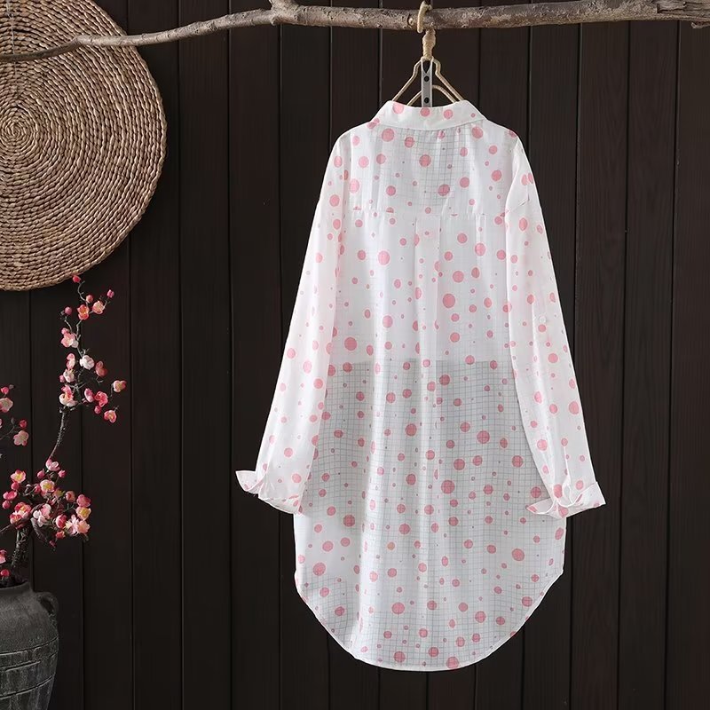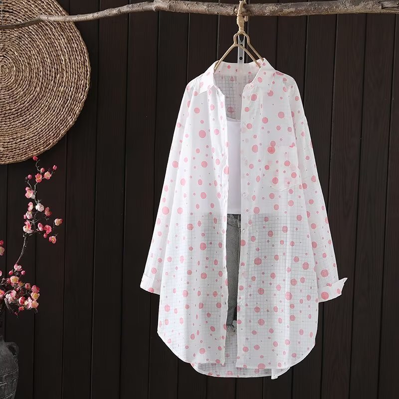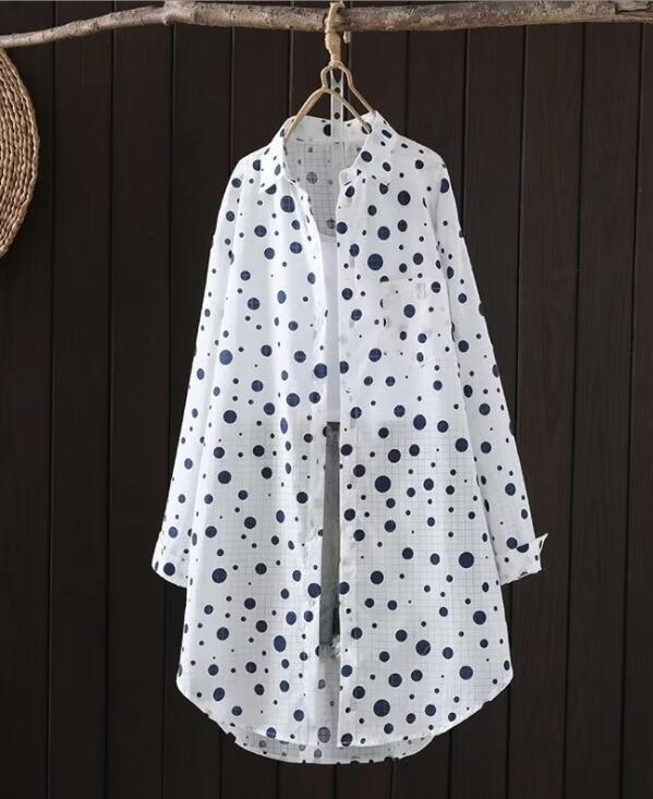人気品人気推薦ワイシャツ チェック柄 薄手 上品 ドット模様 大人可愛 ゆったり オシャレ フリーサイズ ナチュラル 綿100% ネイビー