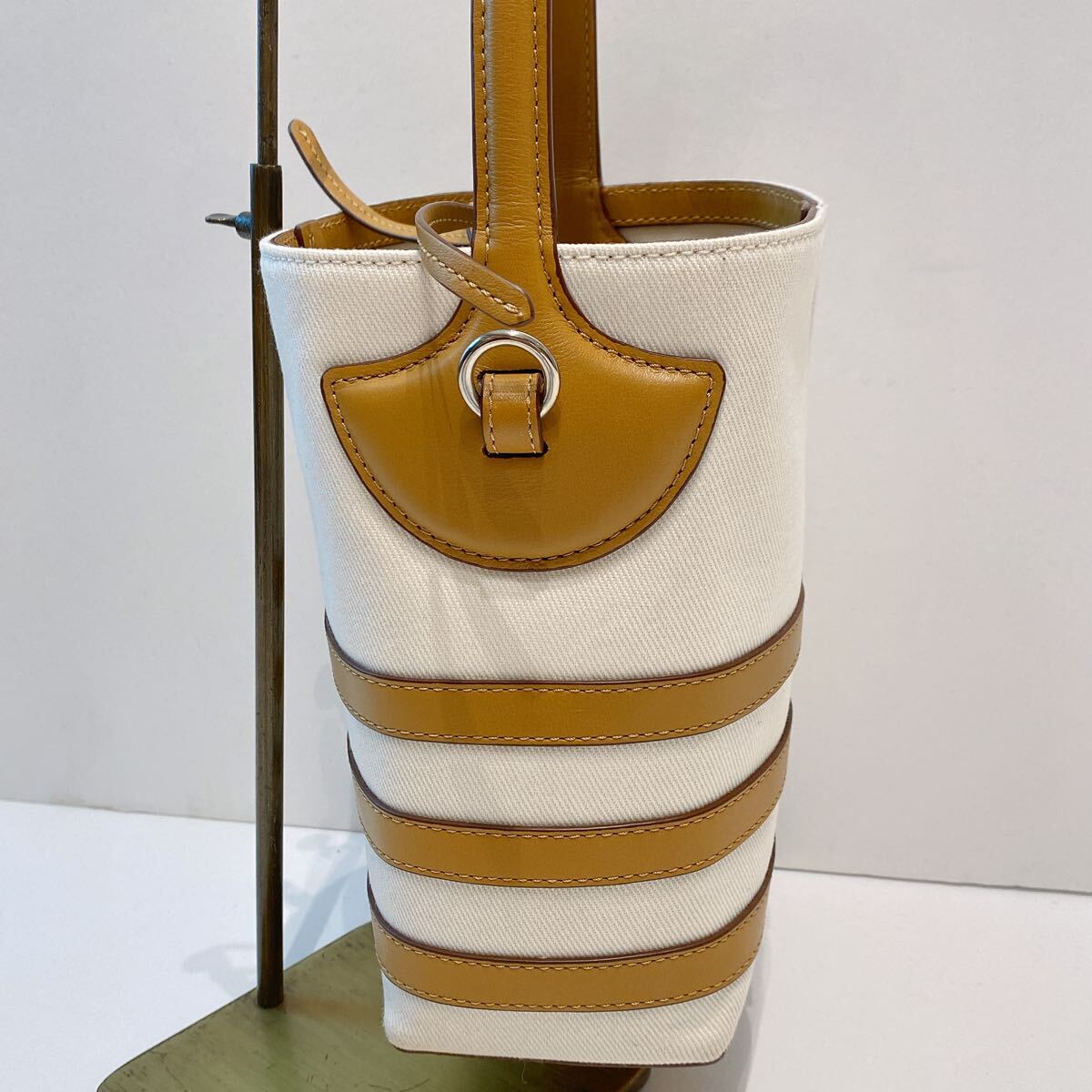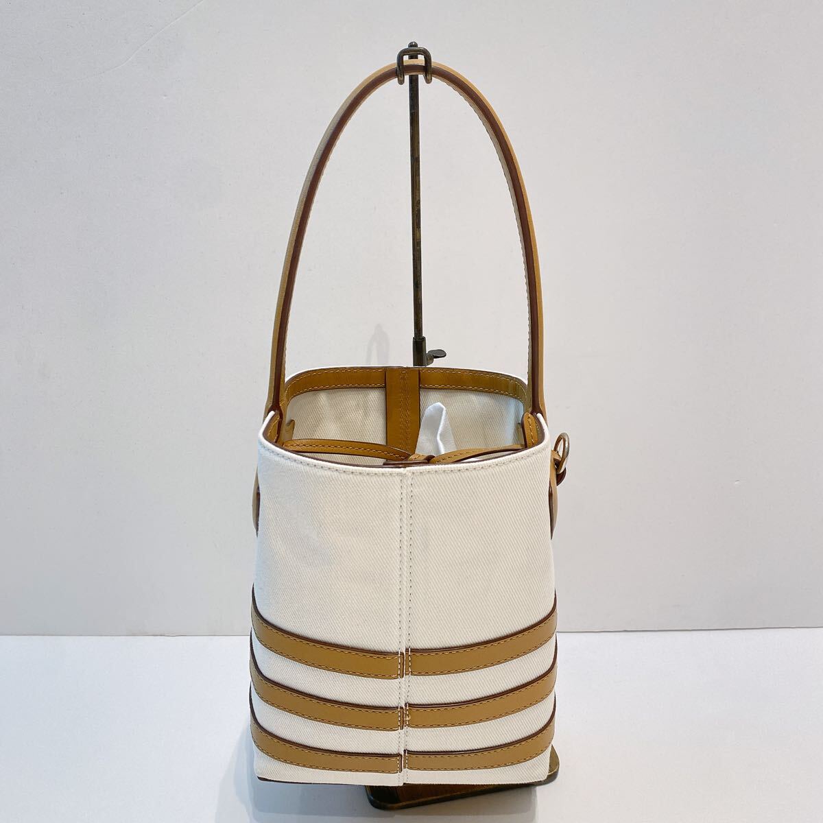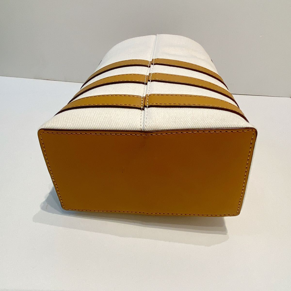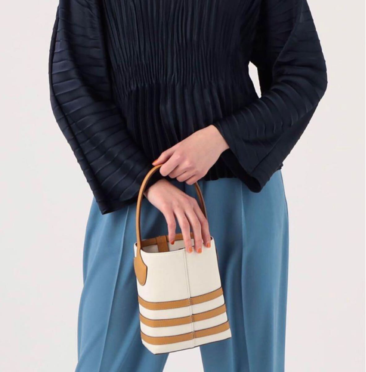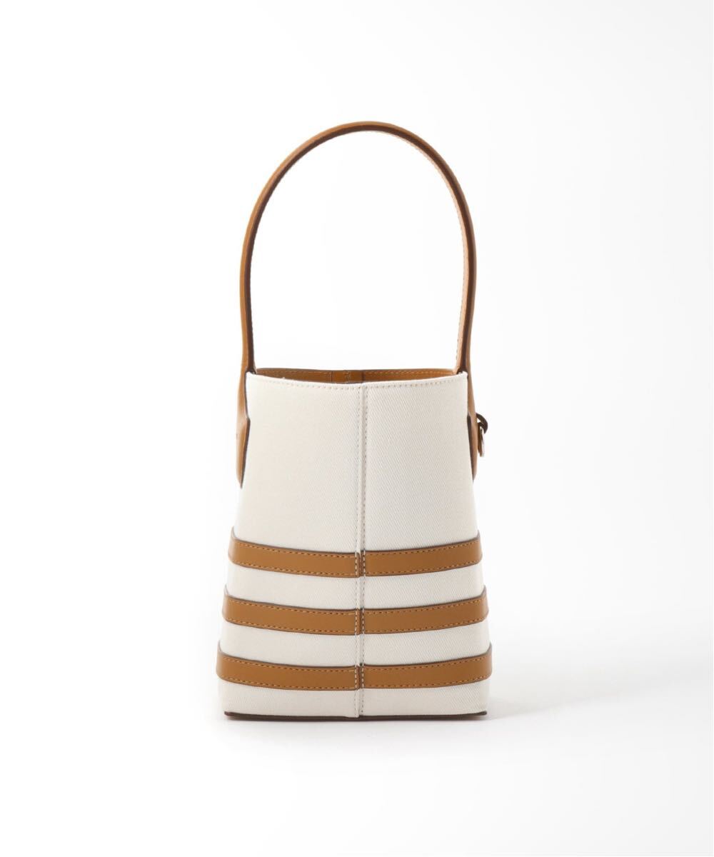 ホワイトとベージュのストライプが特徴のバケツ型ハンドバッグ。