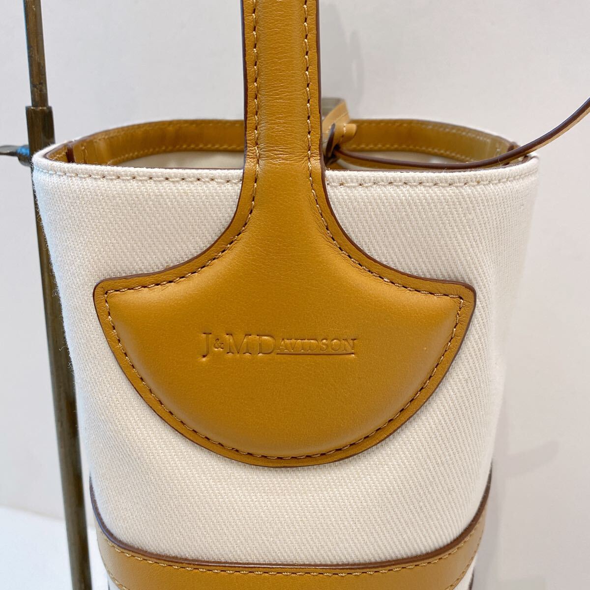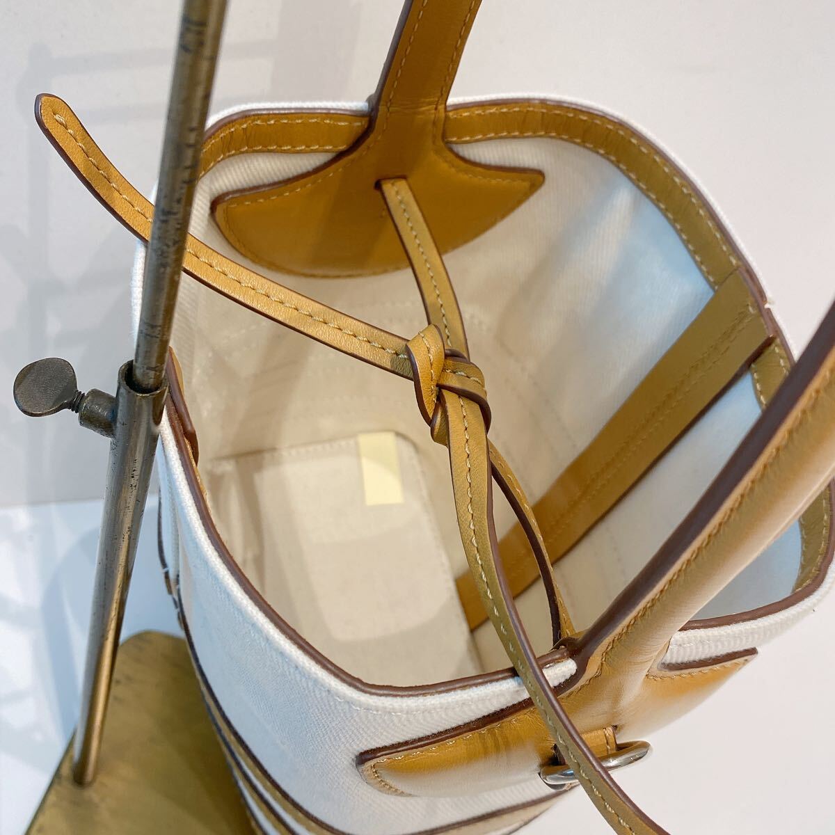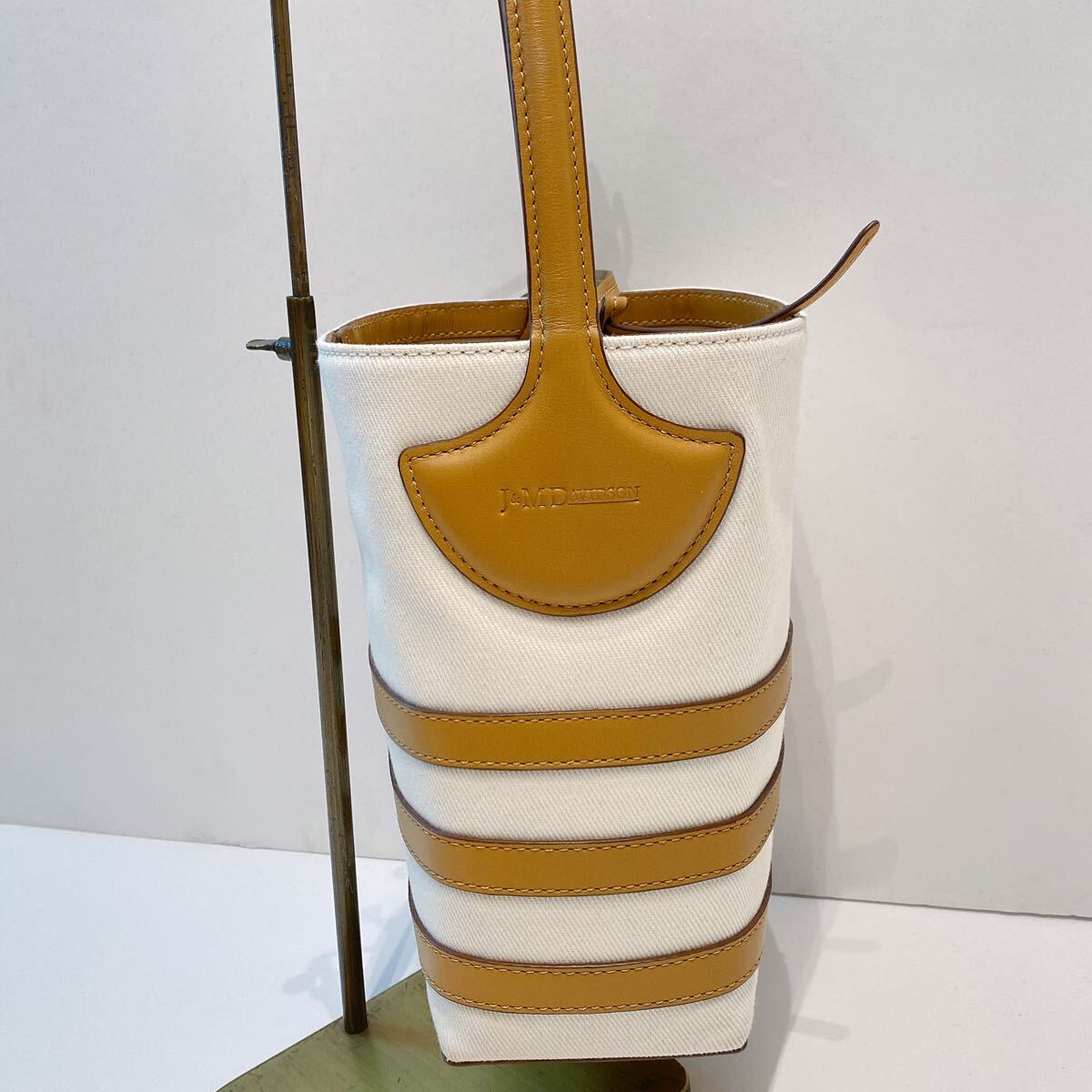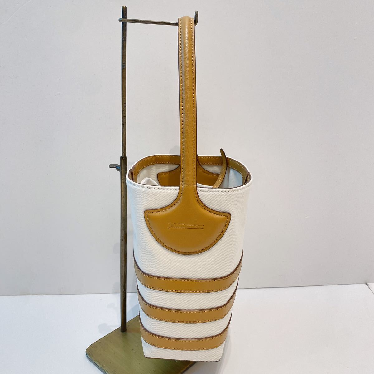 ホワイトとベージュのストライプが特徴のバケツ型ハンドバッグ。