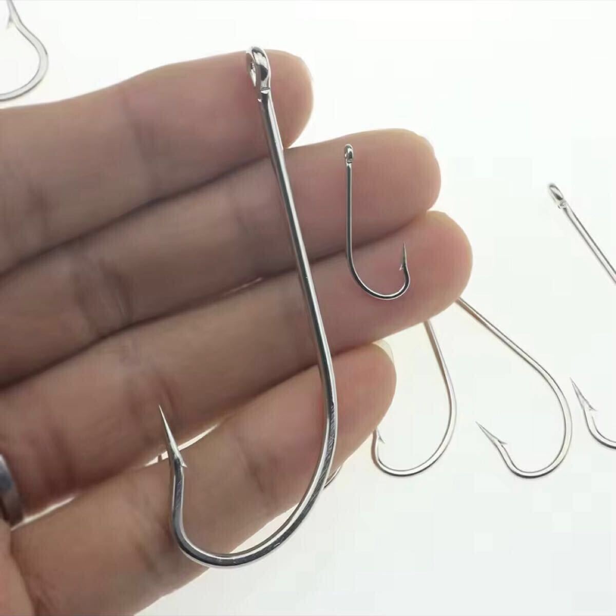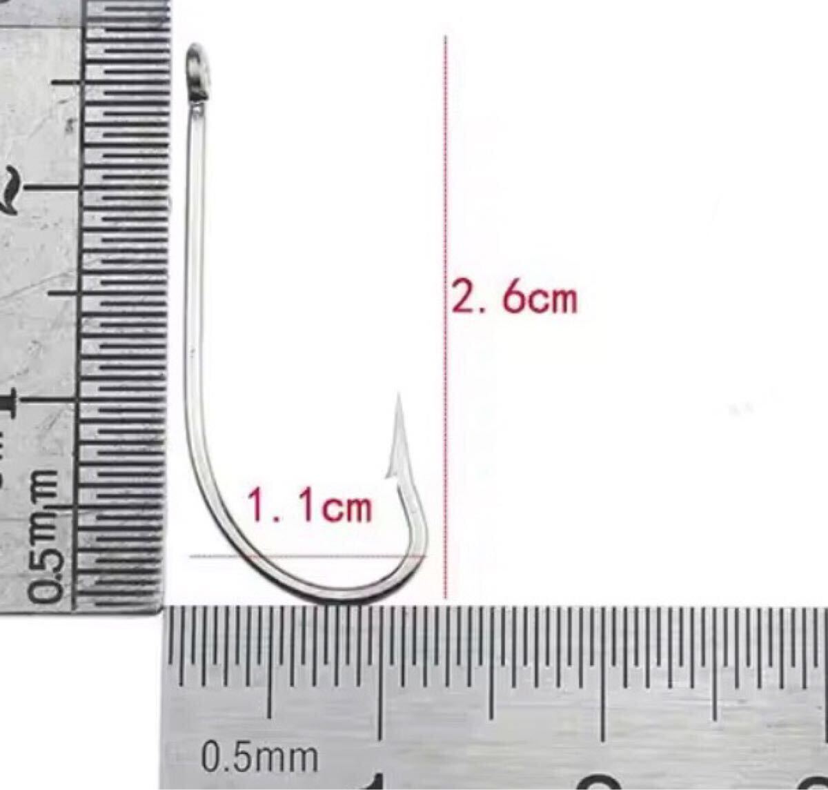 実は本商品はある人のために輸入をはじめました。彼、T氏は2023年に70代で他界しました。とにかく鰻の穴釣りの名人で、出品者は何回も同行したことがあるのですが、かならず出品者の倍以上の鰻を捕獲する人でした。視力が衰えてきて仕掛作りに苦労していたので、出品者が毎年(とは言っても晩年の2年くらいでしたが)仕掛に関して準備しました。T氏はとにかく「大きい針、大きい針」と出品者にリクエストしました。最終的にT氏のお気に入りになったのが本商品です。5LからLまでを出品者の手のひらに乗せて見せると、T氏その時の気分で「今日はコレ」とニヤリとしなが仕掛を選んで川に入って行きました。山間部や上流ではなく、実は目と鼻の先に海がある場所でもこれらの針を使っていました。小さい鰻はリリースしていたので、それをさける目的があったのだとも思われます。余談でした。