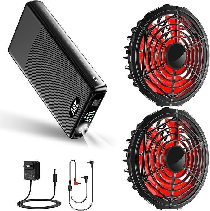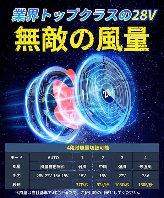 【2025業界初&28V超高出力&作業服 ファンバッテリーセット】2025年最新の熱中症対策、28V 超高出力ファンバッテリーセットが登場!最新型 空調作業服用ファンは航空力学を応用した流線型5枚大面積羽根が搭載して、風の抵抗を40%低減し、風が中心に集まり直進性が高く、パワフルな風を生み出します。30000mAh大容量専用バッテリーが搭載され、ワンボタンでAUTO-15V-18V-22V-28Vに5段階切り替えるだけでなく、同類製品に比べると28V最強風量モードでもパワーが一定で、風量が弱くならないでずっと130/秒で服内に暴風を送ります。28V暴風はいっそう強く、服内を駆け巡る風が、衝撃的な爽快感を生み出す!お手元の空調作業着の性能を最大限発揮できます。