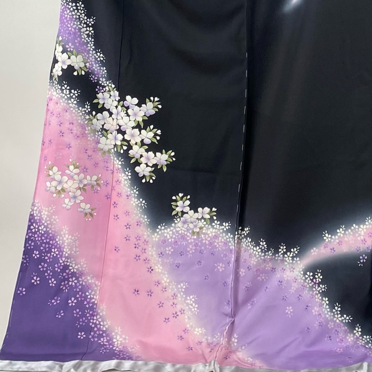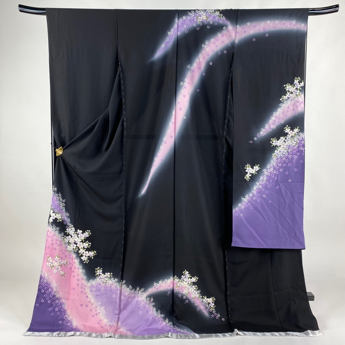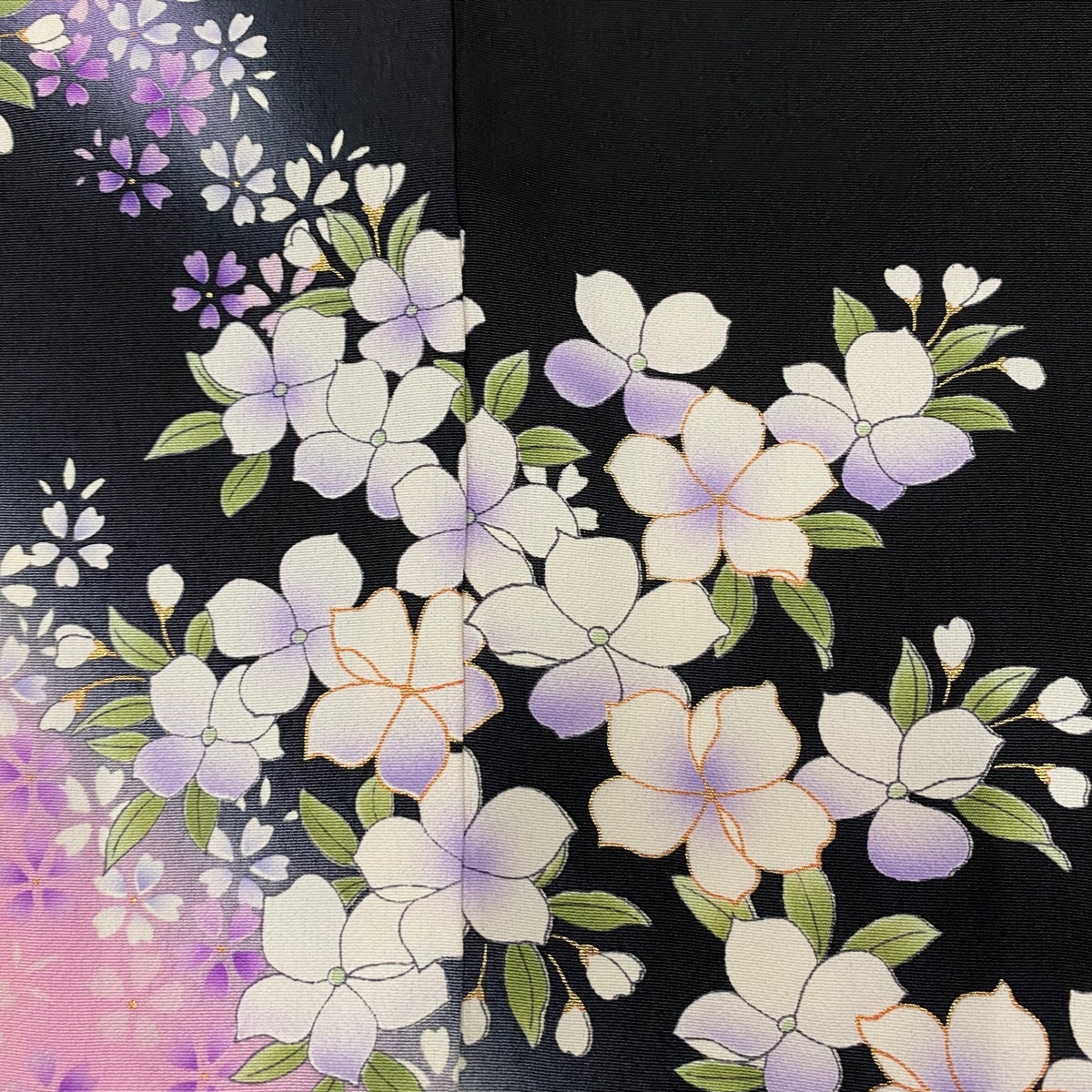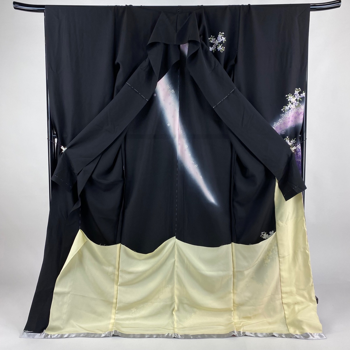 | 振袖 美品 名品 仮絵羽 草花 金彩 染め分け ぼかし 黒 未仕立て 身丈182.5 裄丈69 正絹 【中古】 |
