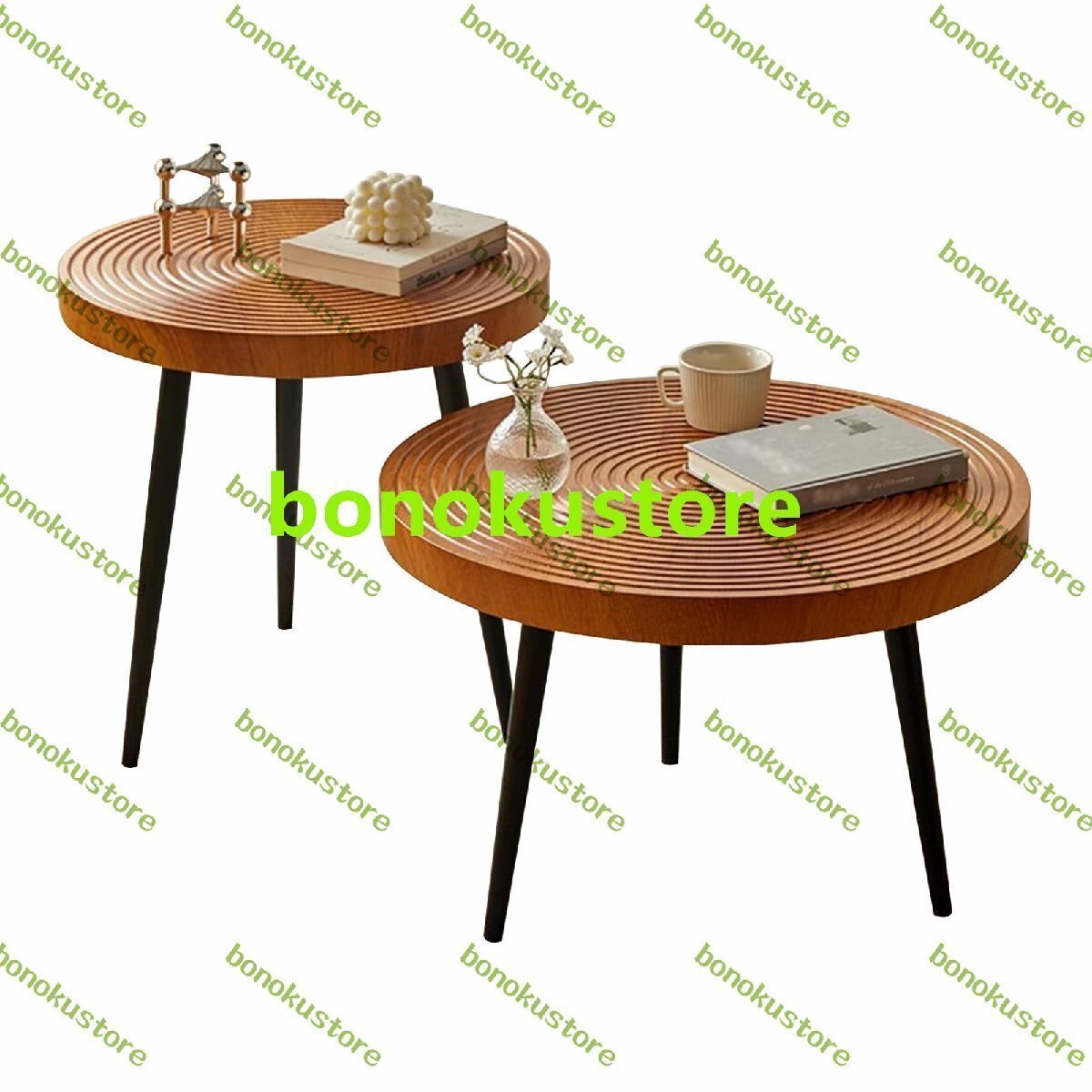 無垢材ラウンドネストコーヒーテーブル2個セット、リビングルーム用モダンセンターテーブルセット、金属脚付きカクテルティーテーブル、ホームオフィス用アクセントスタッキングサイドテーブル
