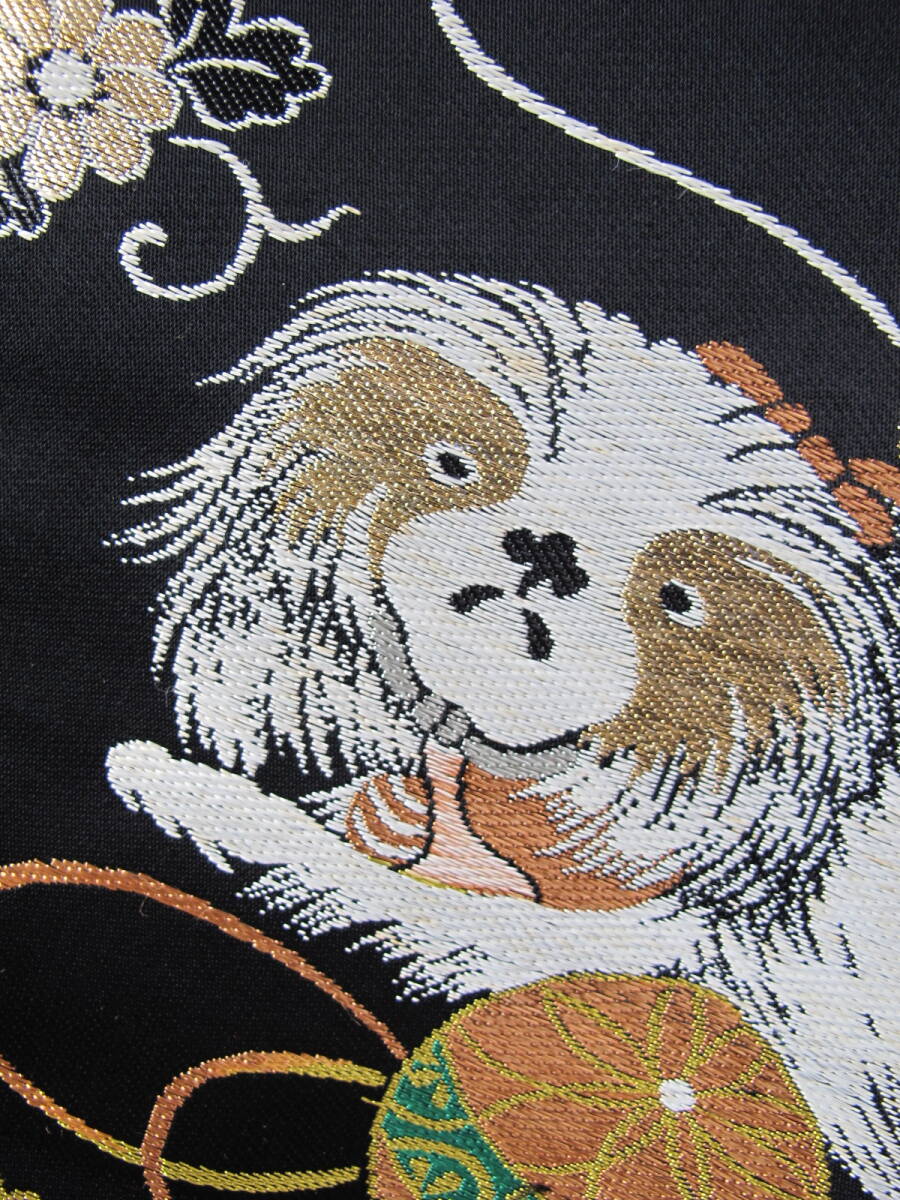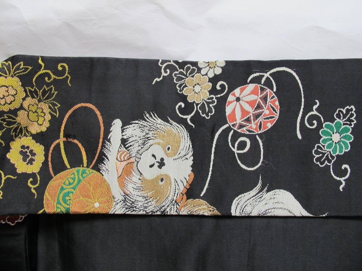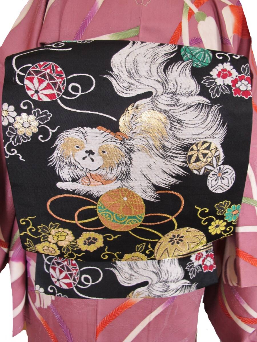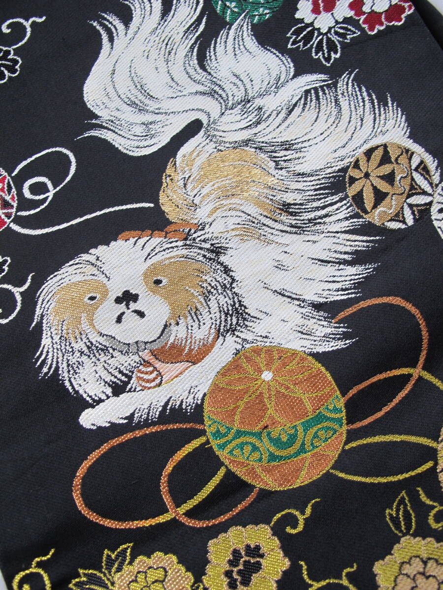 愛らしい狆と手毬を、黒地と花唐草で大人っぽくまとめたアンティーク名古屋帯です。 |