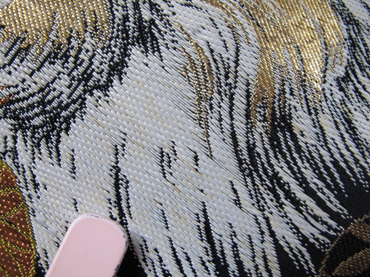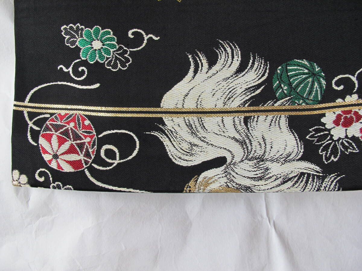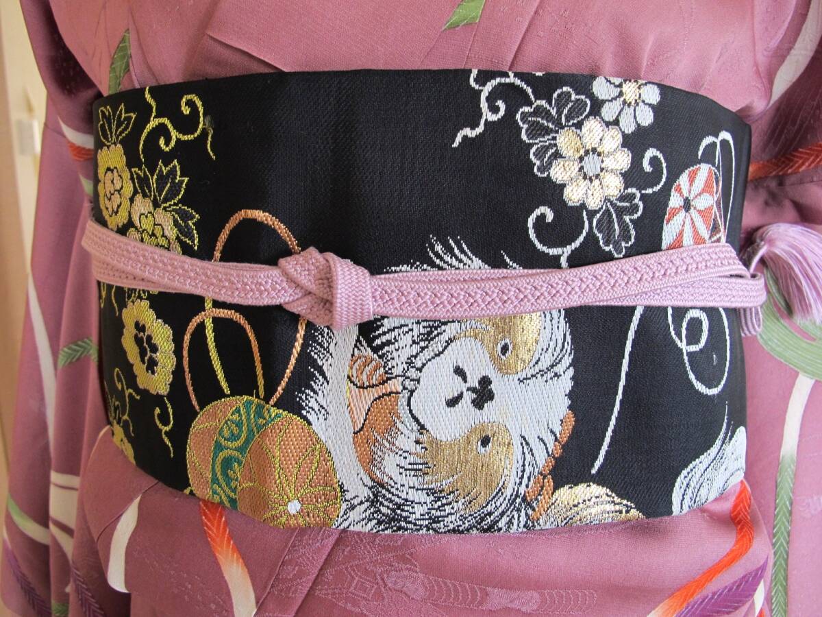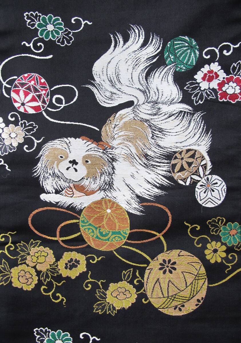 愛らしい狆と手毬を、黒地と花唐草で大人っぽくまとめたアンティーク名古屋帯です。 |