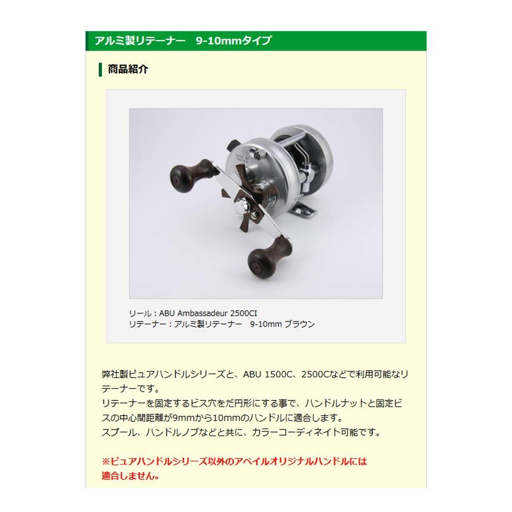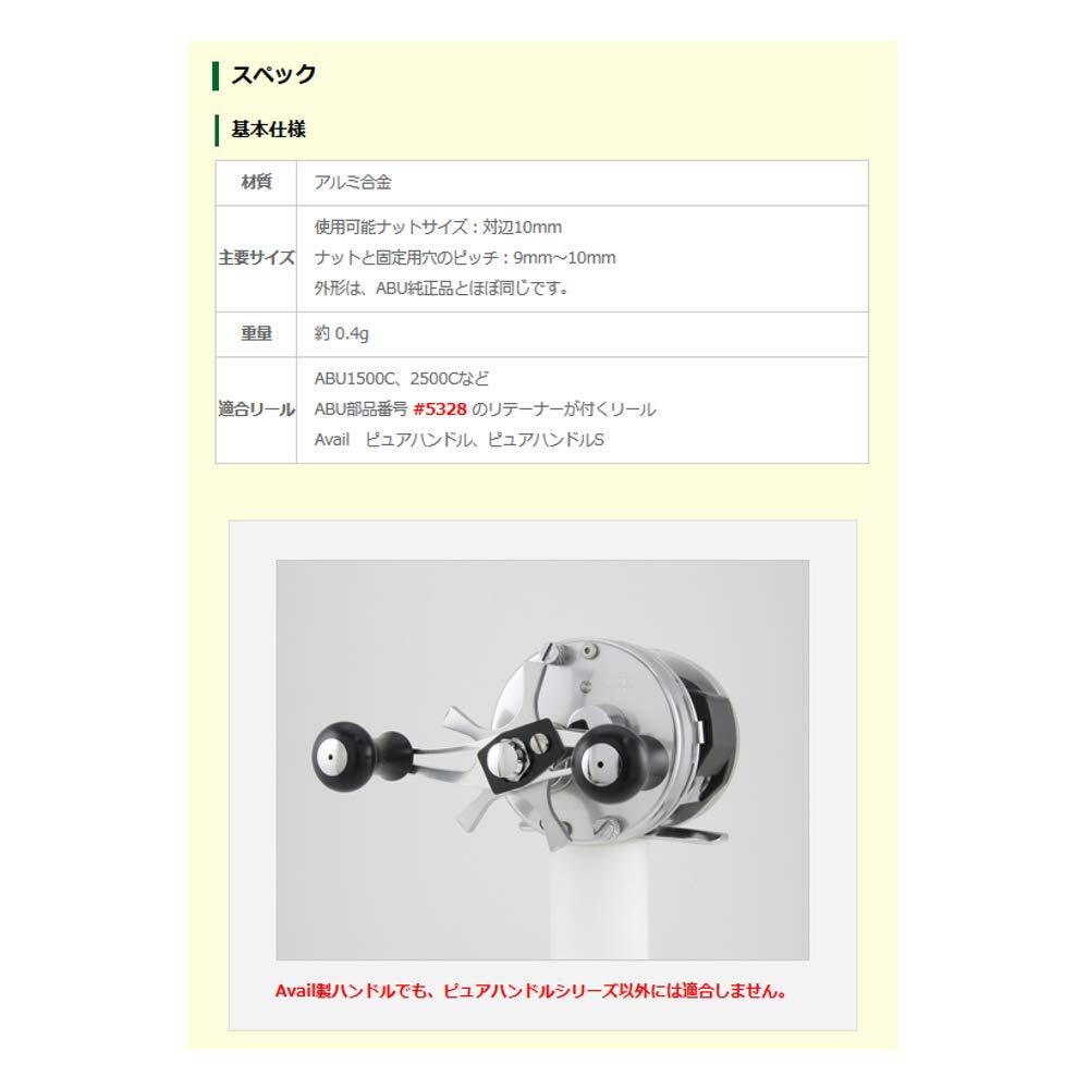 弊社製ピュアハンドルシリーズと、ABU 1500C、2500Cなどで利用可能なリテーナーです。リテーナーを固定するビス穴をだ円形にする事で、ハンドルナットと固定ビスの中心間距離が9mmから10mmのハンドルに適合します。スプール、ハンドルノブなどと共に、カラーコーディネイト可能です。※ピュアハンドルシリーズ以外のアベイルオリジナルハンドルには適合しません。