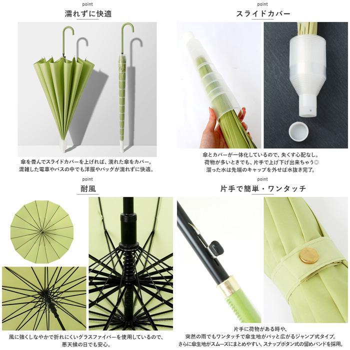 商品説明 | ・・服が濡れない☆スライドカバー付き「長傘 16本骨」の登場。 ・【濡れずに快適】 ・傘を畳んでスライドカバーを上げれば、濡れた傘をカバー。混雑した電車やバスの中でも洋服やバッグが濡れずに快適。 ・【スライドカバー】 ・傘とカバーが一体化しているので、失くす心配なし。荷物が多いときでも、片手で上げ下げ出来ちゃう◎溜った水は先端のキャップを外せば水抜き完了。 ・【耐風】 ・風に強くしなやかで折れにくいグラスファイバーを使用しているので、悪天候の日でも安心。 ・【片手で簡単・ワンタッチ】 ・片手に荷物がある時や、突然の雨でもワンタッチで傘生地がパッと広がるジャンプ式タイプ。さらに傘生地がスムーズにまとめやすい、スナップボタン式の留めバンドを採用。 ・【女性らしい印象】 ・細身の持ち手とゴールドの金具が女性らしい印象。 |