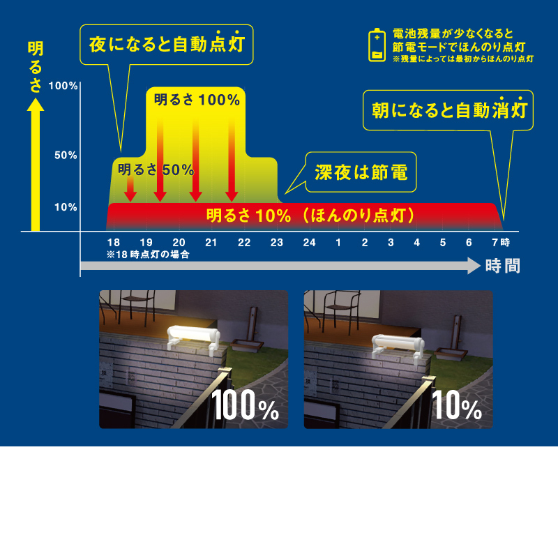 ・ソーラー充電不足でもライトが切れないようライトの明るさを自動で調整します。