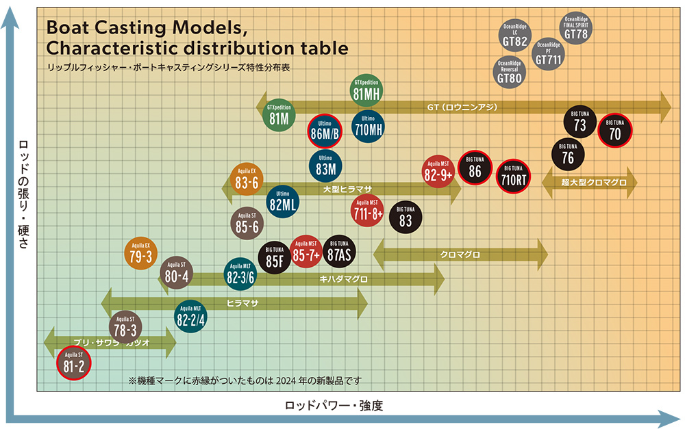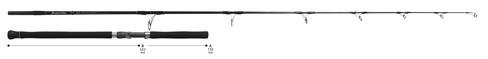 進化するヒラマサの大型ベイトパターン攻略の中で、このMST 82-9+は年々大型化しているプラグに対応したモンスター攻略特化型モデルです。240mmを超えるサイズのプラグも無理なくフルキャストでき、また軽快に大型ルアーをアクションできる操作性能を持っています。またAquila MSTシリーズの特徴である粘りを融合した高いリフト力はモンスタークラスとのファイトをメインに想定しており、根の荒いシャローエリアや潮流の激しいエリアでも真っ向勝負が可能です。パワーの中に扱いやすさを追求したモデルではありますが、シリーズ最強のモデルであり、使用にはある程度の体力と経験を必要とします。しかし、モンスタークラスのヒラマサを追う中で、大型ルアーの必要性を感じているアングラーには確実なアドバンテージを約束するモデルです。