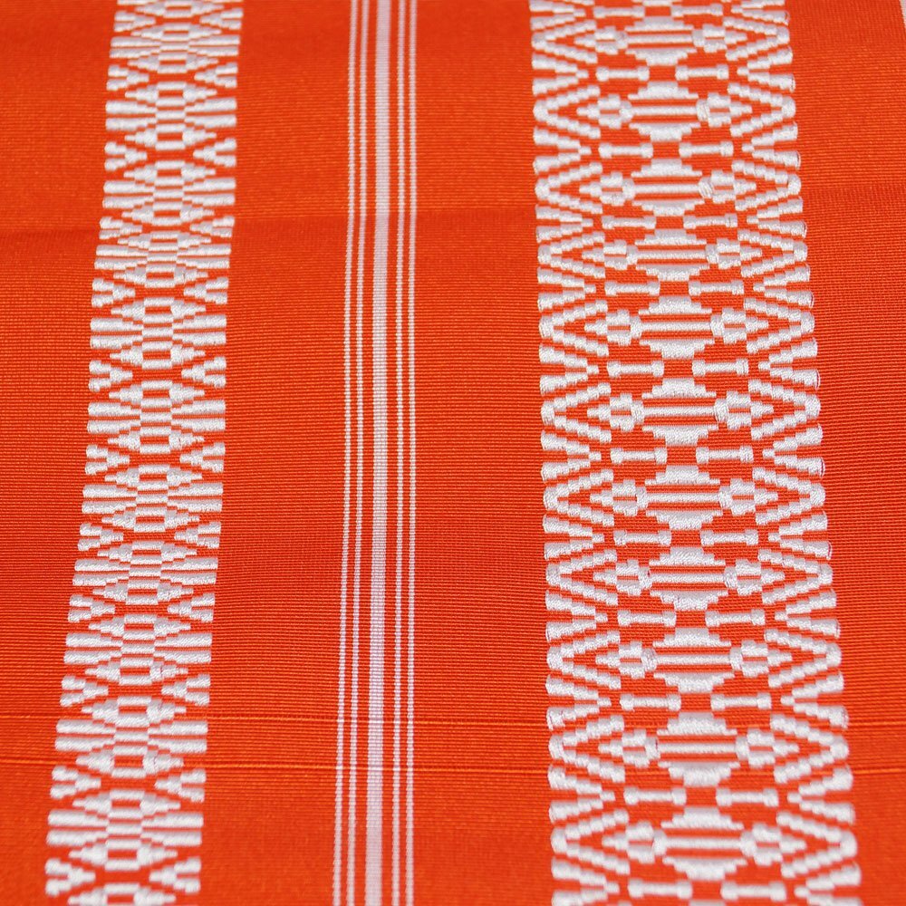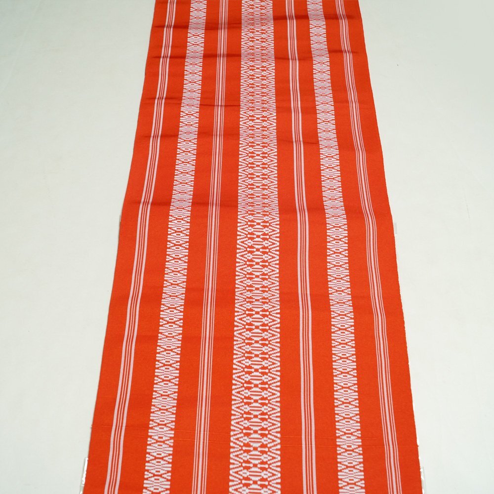 | 商品 説明 | 緋色系の地に白の献上縞模様が織られた八寸名古屋帯地です。 |