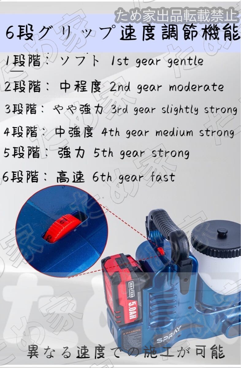 特徴:1.効率的な流量で大容量:広々とした1.2Lホッパーと1.1L/分の流量を備えたこの噴霧器は、補充を最小限に抑えながら壁やフェンスなどの広い表面を効率的にカバーします。2.カスタマイズ可能なスプレー速度: 6 つの調整可能な速度設定により、さまざまな種類の塗料に均一に塗布でき、15MPa の強力な圧力で正確な結果が得られます。3.人間工学に基づいた軽量設計: 重量はわずか 2.8kg で、ハンズフリーでベルトを固定できるため、比類のない携帯性を実現し、長時間の使用でも疲労を軽減します。4.取り外し可能な長寿命バッテリー:内蔵インジケーターを備えた21V/5Aリチウムバッテリーを搭載しており、小規模プロジェクトと大規模プロジェクトの両方に信頼性の高い実行時間と利便性を提供します。5.500W 高性能モーター: 滑らかな扇形のスプレー パターンを実現し、細かい屋内作業や広範囲にわたる屋外用途に最適です。すべて付属のメンテナンス キットでサポートされています。仕様:名前: エアレスペイントスプレーブラシ付きモーター出力: 500W最大流量: 1.1L/分バッテリー容量: 1200mAH速度調整: 6 段階の速度調整可能 ホッパー容量:1.2L製品サイズ: 33*28*16 センチメートル/16.1 × 14.2 × 7.5 インチ重量: 2.8kg梱包後のサイズ: 44.5*32*20cm/17.5*12.6*7.9インチ梱包後の重量:約5.3kg製品の梱包:1 * 高圧エアレススプレー機 1 * ベルト/固定具1 *ホース1 *エアブラシ1 * リチウムイオン電池注記:1.写真と実際の商品の色は若干異なる場合がございます。正確な色をお見せできるよう最善を尽くします。2.手動測定のため、わずかな寸法の違いはご容赦ください。