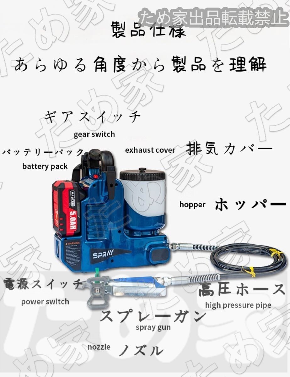 【高性能モーター】500Wモーターは、最小限の労力で均一なコーティングを行うための細かい扇形のスプレーパターンを実現し、屋内と屋外の両方のプロジェクトで信頼性の高いパフォーマンスを保証します。家具の仕上げから大規模な壁の塗布まで、この噴霧器はさまざまな作業を簡単に処理します。さらに、付属のツールキットは保管に便利で、メンテナンスが容易になり、長期的な信頼性が保証されます。