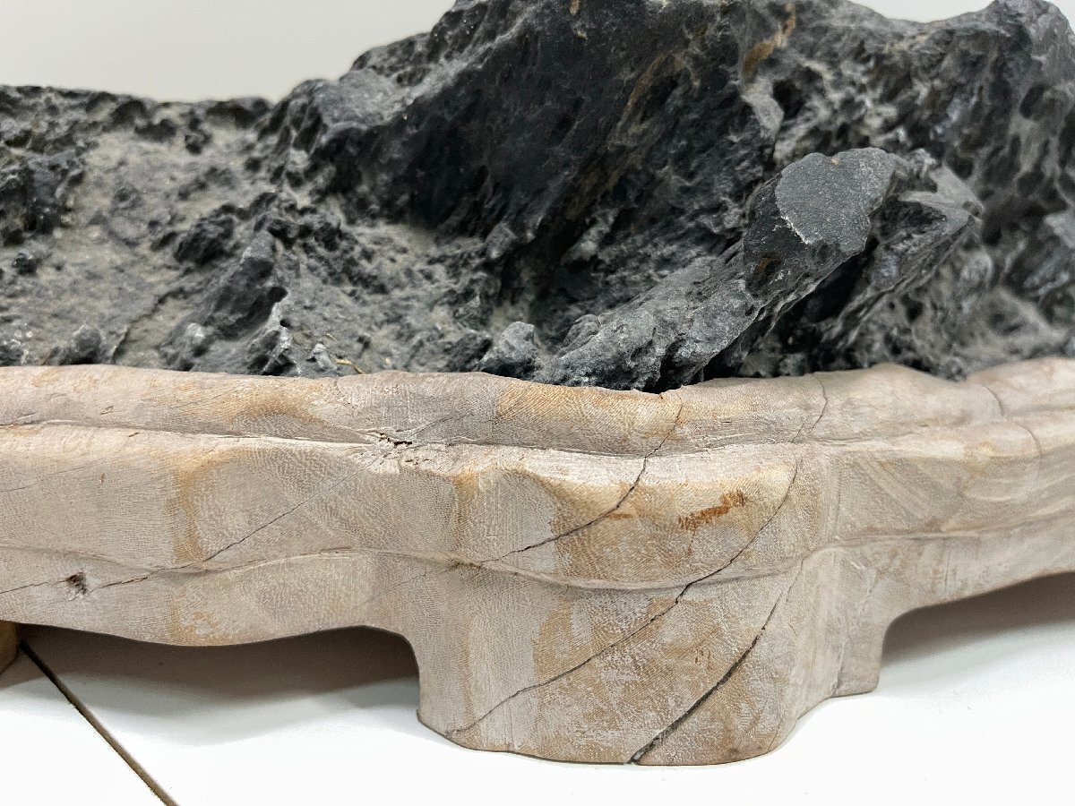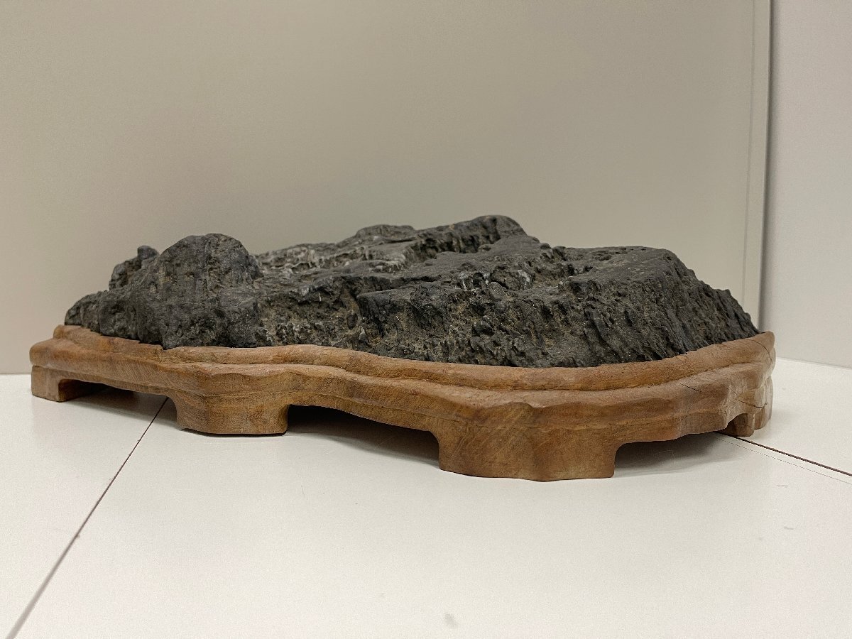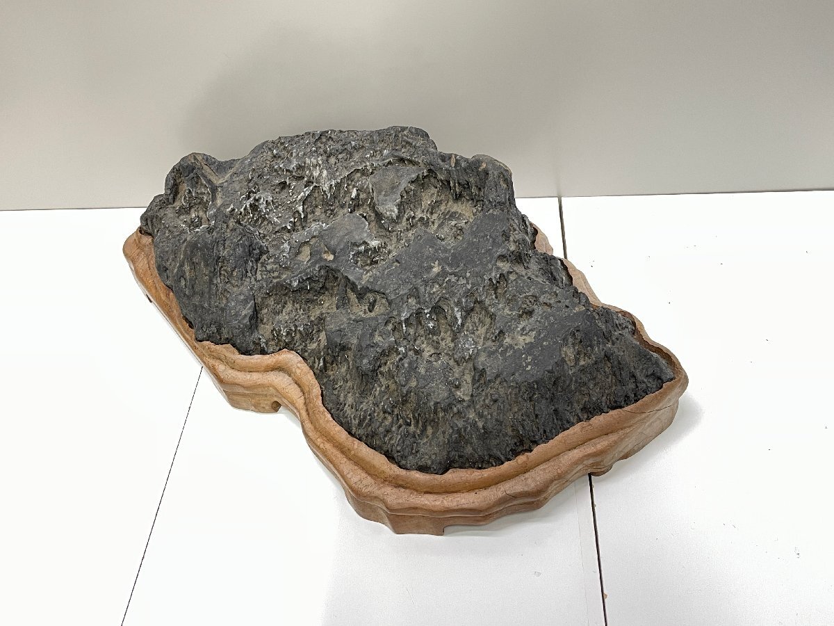 ●台座付き水石 盆栽 盆石 45×27×12cm ストーン オブジェ 自然 天然石 鑑賞石 岩 庭園 枯山水 木製台 装飾品 飾り石 コレクション (1)