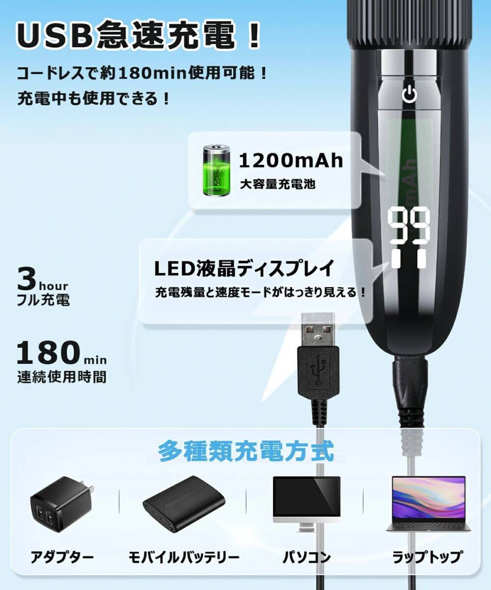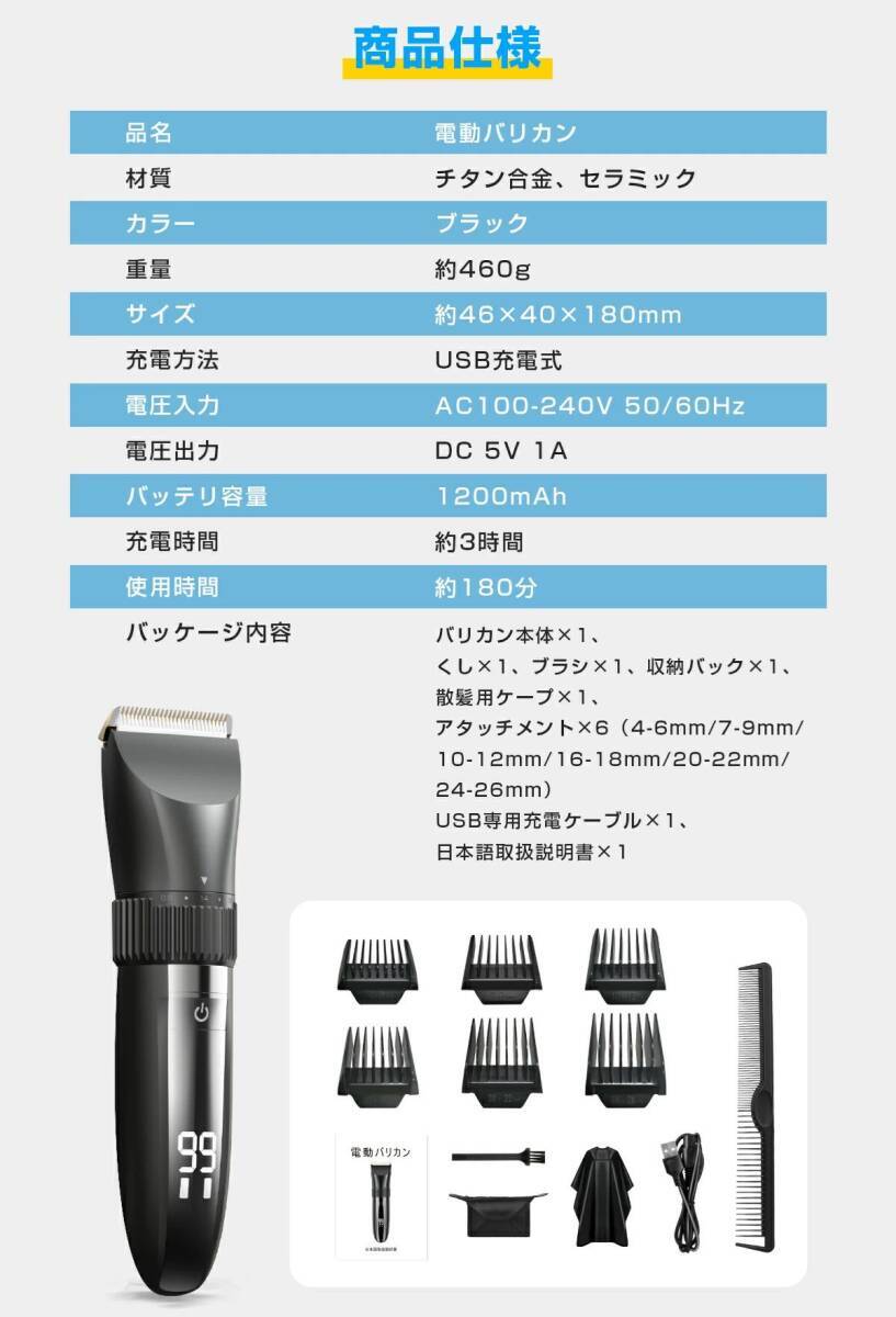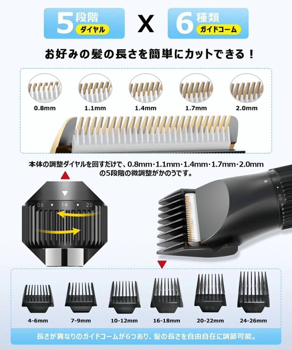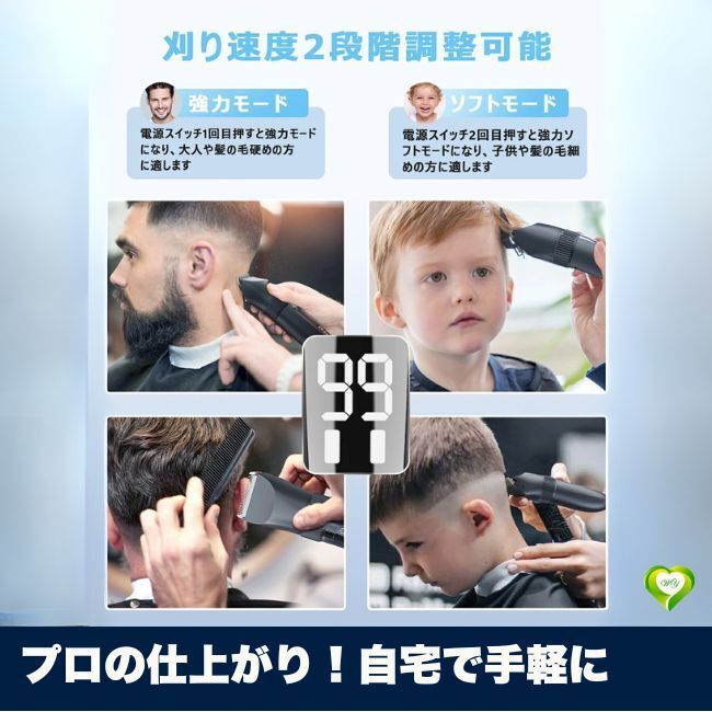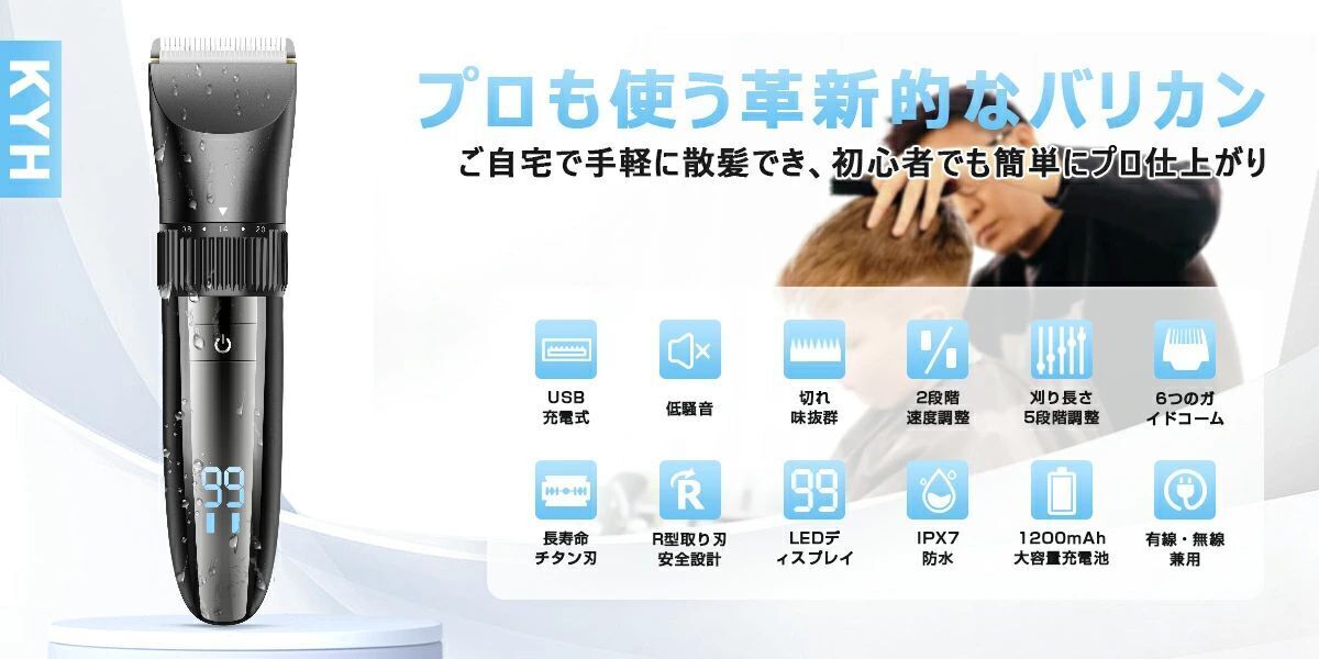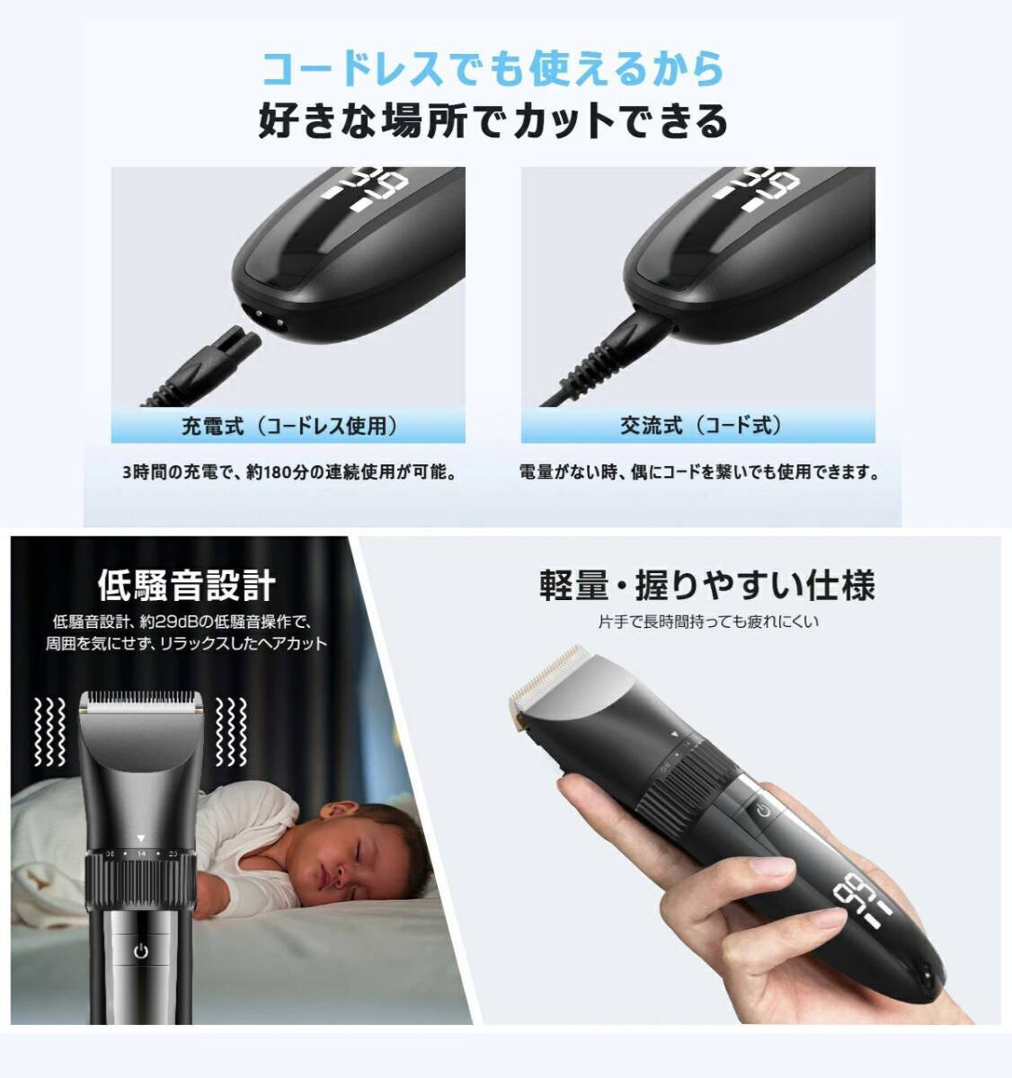 ご覧いただきありがとうございます。 商品名:バリカン 【この商品が品質で選ばれる理由】 LEDディスプレイと2段階速度調整で、家族みんなで使える高性能防水バリカンです。 ■こんな悩みありませんか? ・子供から大人まで、家族みんなで使えるバリカンが欲しい ・充電残量や速度設定が見やすいバリカンが便利 ・お手入れが簡単な防水バリカンを探している ★こんな時におすすめ! ・自宅で手軽に家族のヘアカットをしたい時 ・子供が寝ている間に静かにカットしたい時 ・お風呂場で手軽にヘアカットしたい時 ------------------------------------- ◆商品説明 【知能的なLEDディスプレイ&変速調節】 ・LEDカラーディスプレイ搭載で、電源残量やスピードレベルが一目で分かります。 ・2段階速さ調整可能で、子供から大人まで使えます。 【5段階刈り高さ調節&豊富なアタッチメント】 ・ダイヤル式で0.8mm~2.0mmまで5段階の刈り高さ調節が可能です。 ・6種類のガイドコームが付属し、簡単に好みのヘアスタイルに仕上がります。 ・最短0.8mmでの散髪が可能です。(※坊主頭や髭剃りには使用できません) 【切れ味抜群&肌に優しい】 ・強力モーター搭載で、スムーズにカットできます。 ・チタン合金とセラミック製の刃で、錆びにくく、安全なR面取り刃設計です。 ・自動研磨システムで、切れ味が長持ちします。 【大容量バッテリー&充電しながら使用】 ・1200mAh大容量バッテリー搭載で、約3時間の充電で約180分連続使用可能です。 ・コードレスで使用でき、充電しながらの使用も可能です。 【IPX7防水&簡単メンテナンス】 ・IPX7級防水仕様で、本体も水洗い可能です。 ・刃とガイドコームの取り外しが簡単で、お手入れが楽です。 ・低騒音設計で、子供や赤ちゃんにも安心です。 【付属品】 ・バリカン本体、くし、ブラシ、収納バック、散髪用ケープ、アタッチメント6種、USB充電ケーブル、日本語取扱説明書が付属します。 ご不明な点などございましたら お気軽に「質問する」からお問い合わせください。 |