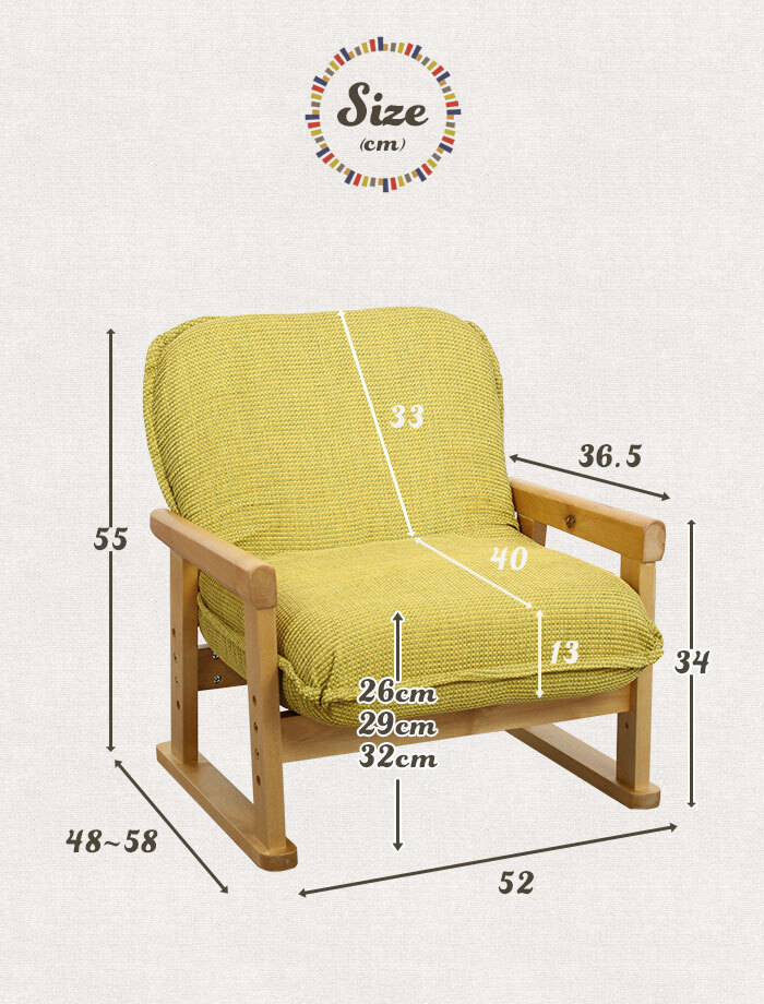 | ソファなどに使われる「ポケットコイル」を使用、ヘタリにくく弾力のある快適な座り心地。 フレームへの取り付け位置を変えることで座面の高さを「26cm・29cm・32cm」の3段階で調節できます。 フレームは天然木を使用。 肘置きに丸みを持たせ、立ち上がる際もしっかり握ることができます。 使わない時や移動する時に便利。 脚裏にはフェルトが付いているので、床や畳の傷を防ぎます。 和室にも洋室にも溶け込む、ちょっとくすんだ色合い。 ブルー、オレンジ、グリーン、ブラウンの4色よりお選びいただけます。 |
