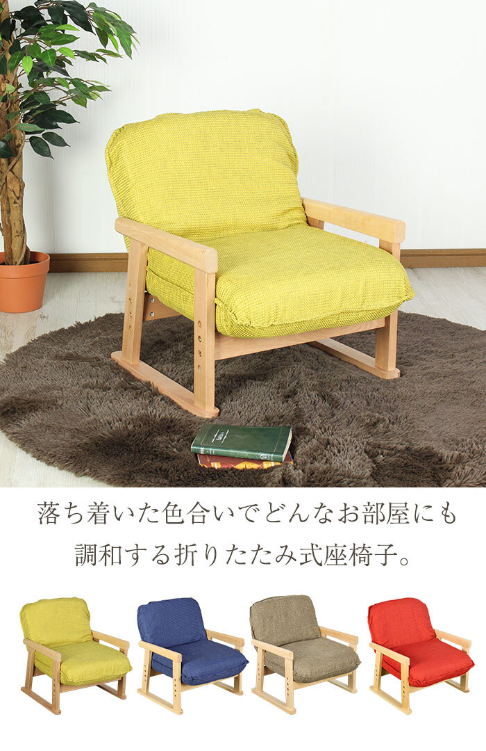 | ソファなどに使われる「ポケットコイル」を使用、ヘタリにくく弾力のある快適な座り心地。 フレームへの取り付け位置を変えることで座面の高さを「26cm・29cm・32cm」の3段階で調節できます。 フレームは天然木を使用。 肘置きに丸みを持たせ、立ち上がる際もしっかり握ることができます。 使わない時や移動する時に便利。 脚裏にはフェルトが付いているので、床や畳の傷を防ぎます。 和室にも洋室にも溶け込む、ちょっとくすんだ色合い。 ブルー、オレンジ、グリーン、ブラウンの4色よりお選びいただけます。 |