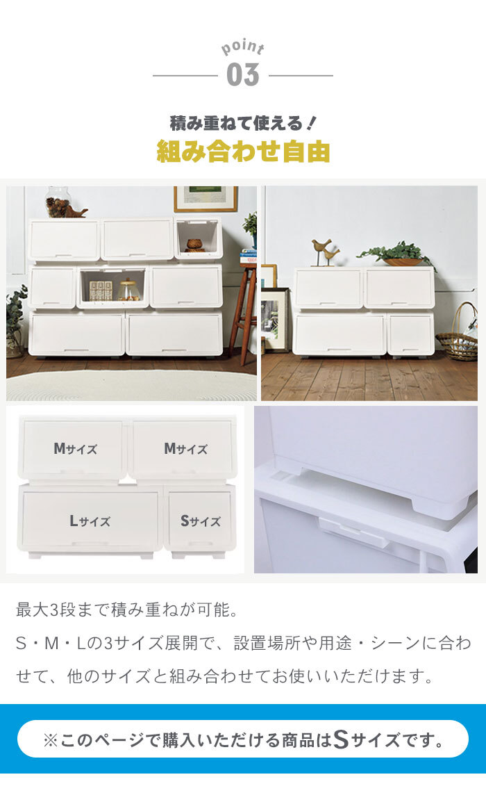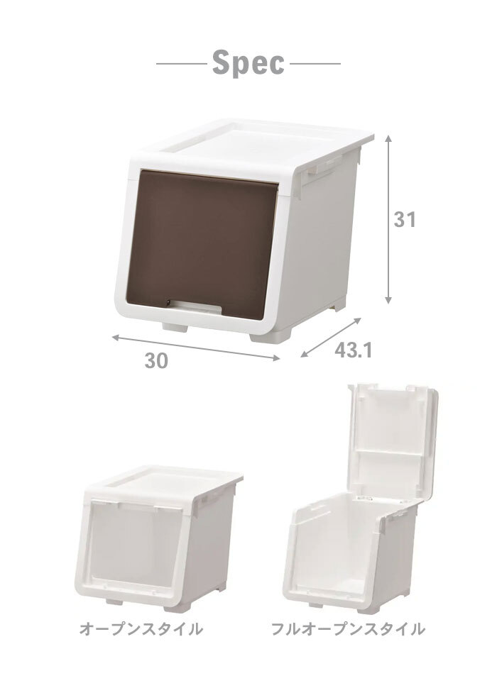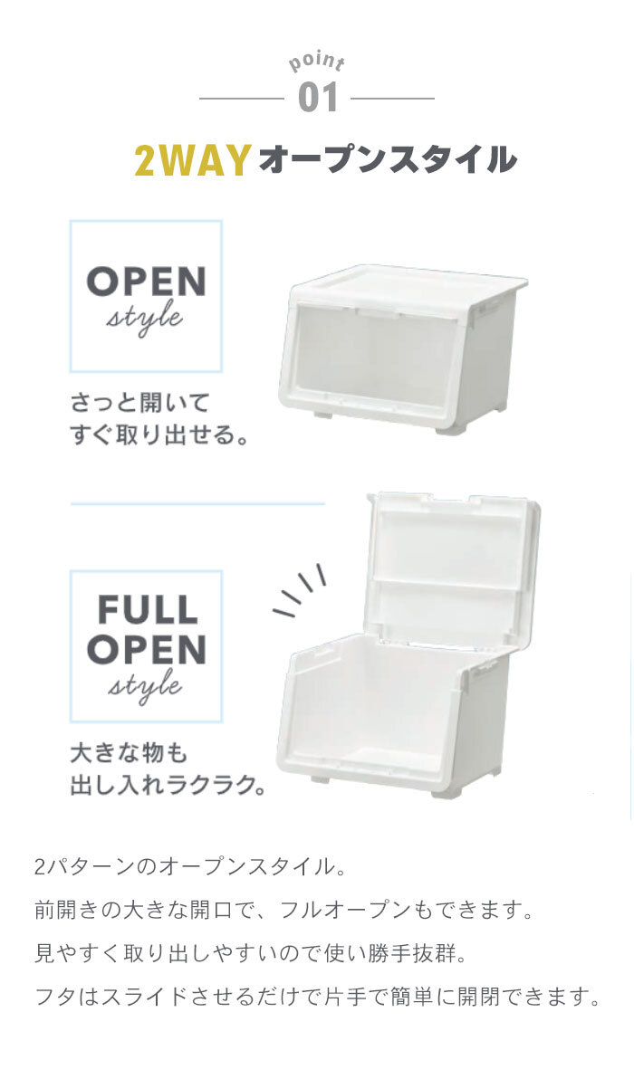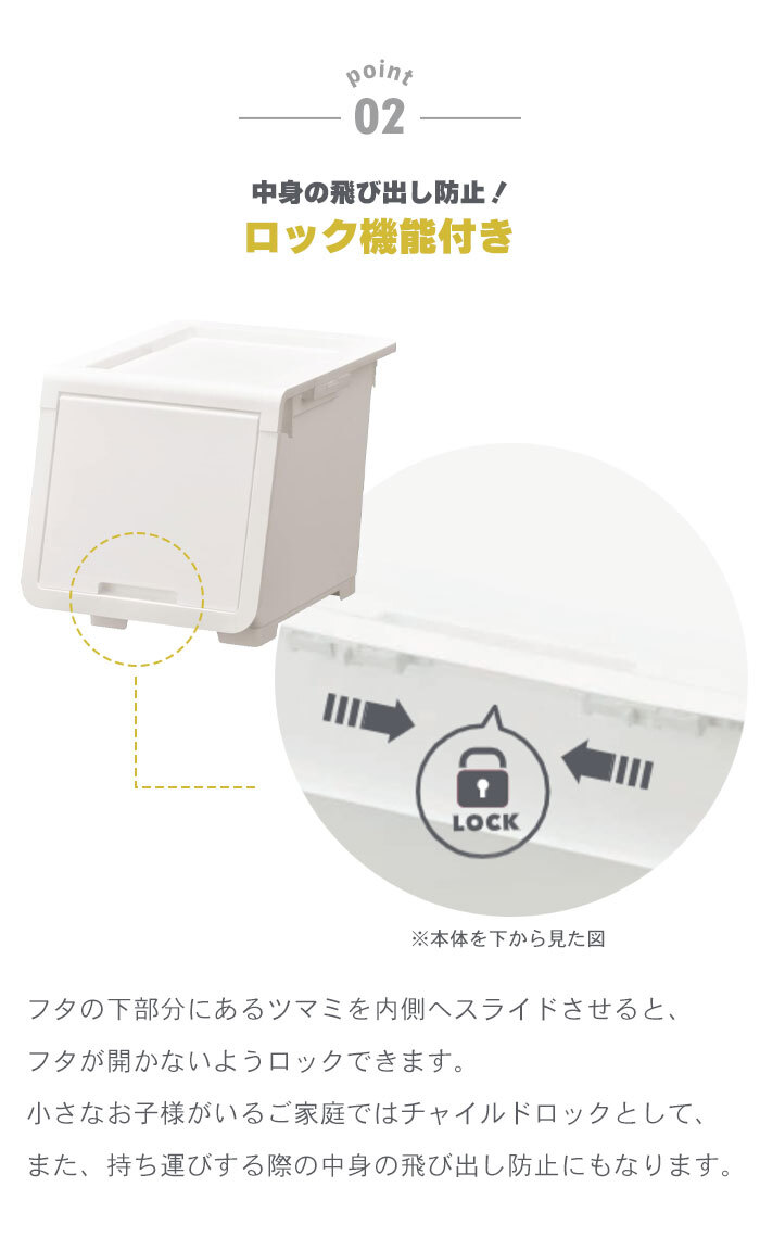 | ロック付きのフラップ式収納ボックス。 サッと開いてすぐ取り出せる前開きスタイル、大きなものや奥にしまったものの出し入れがしやすいフルオープンスタイルの2パターンのオープンスタイル。 フタを本体に収納できるので、口を開けたまま出し入れができて便利。 内側へスライドさせると蓋が開かないようロックされるロック機能付き。 小さなお子様がいるご家庭ではチャイルドロックとして、また、持ち運びする際の中身の飛び出し防止にもなります。 フタの上部の溝と本体の脚が合うように設計されているので、ズレずにしっかり積み重ねができ、リビングや子供部屋、キッチン、ランドリー周りなど場所を選ばずお使いいただけます。 (※最大3段まで積み重ね可能) S・M・Lの3サイズ展開で、他のサイズとも積み重ねてお使いいただけます。 ※このページで購入いただける商品はSサイズです。 安心安全の日本製。 |