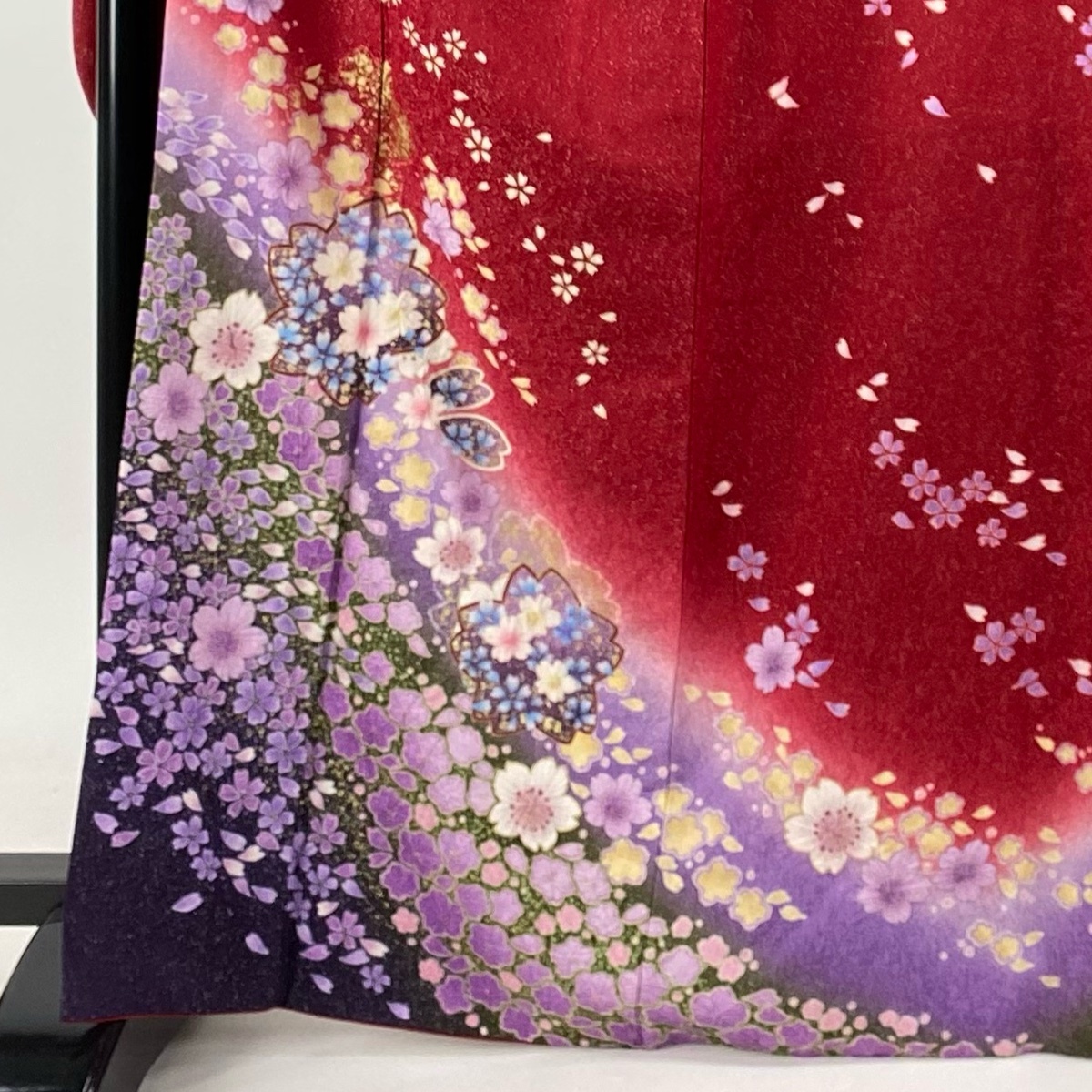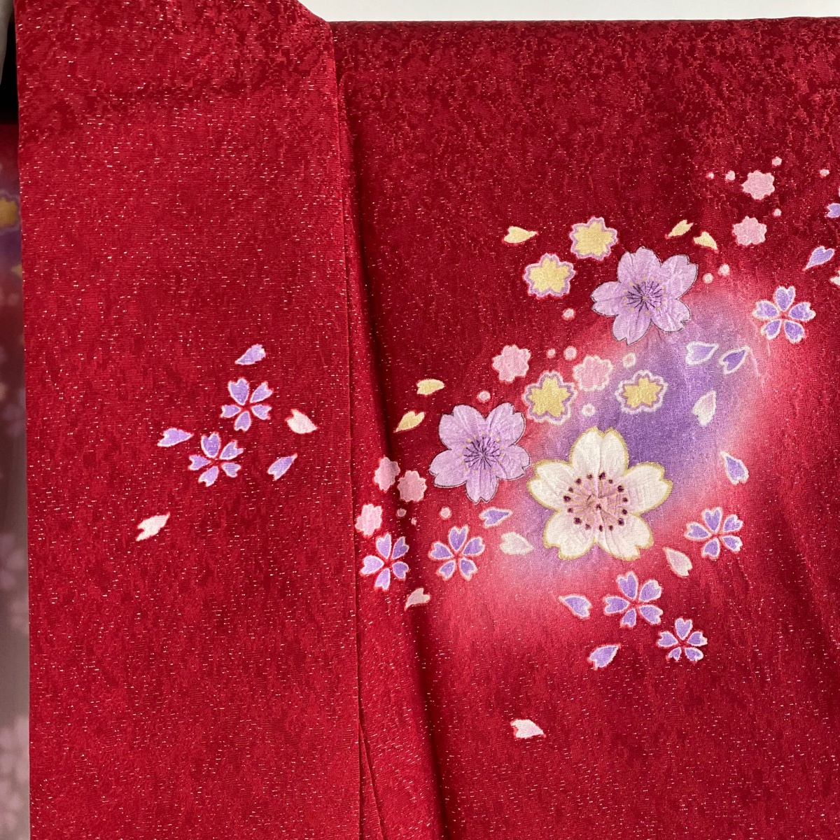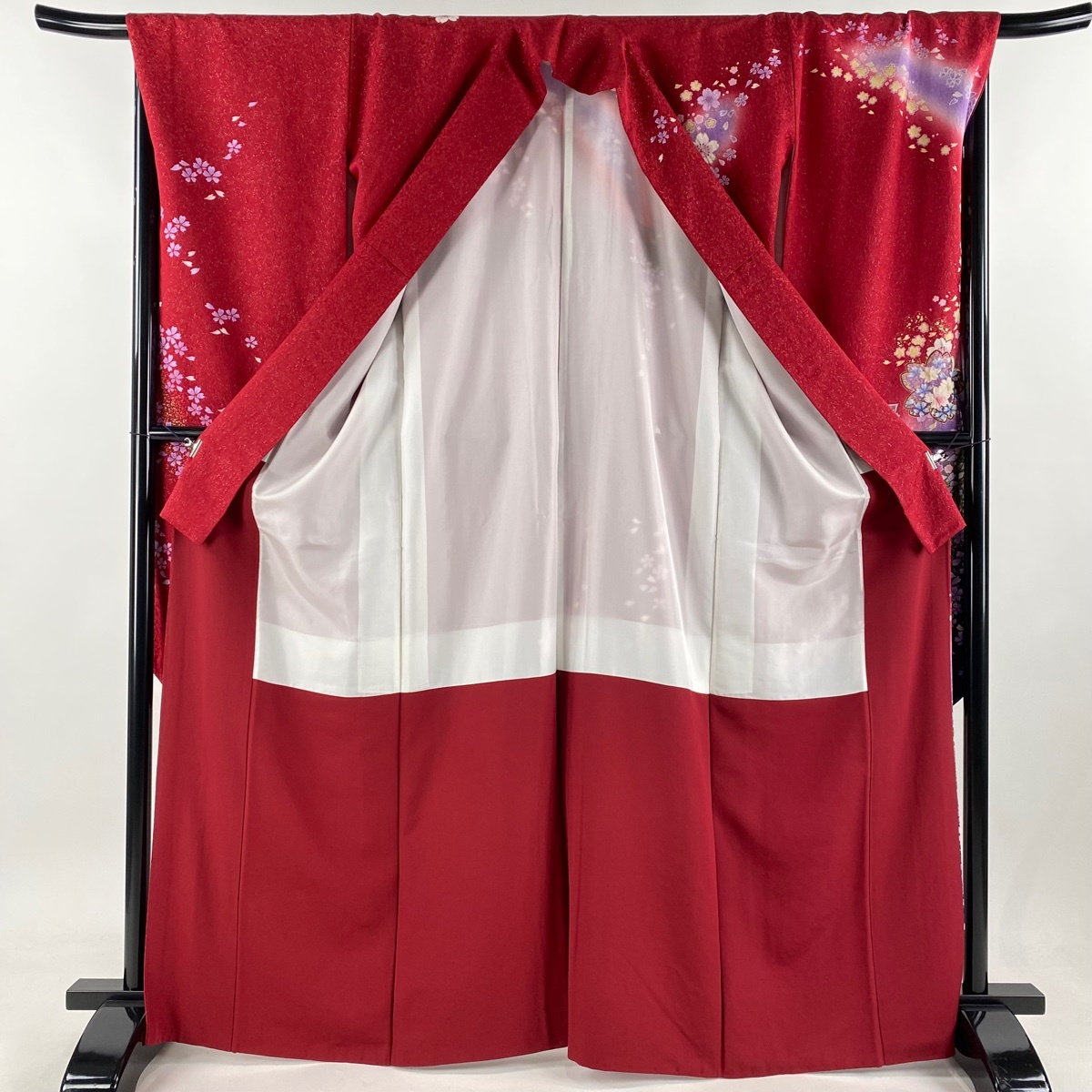 振袖 美品 逸品 やまと 桜 桜の花びら 銀通し 絞り 赤 袷 身丈167 裄丈69 L 正絹 【中古】 |