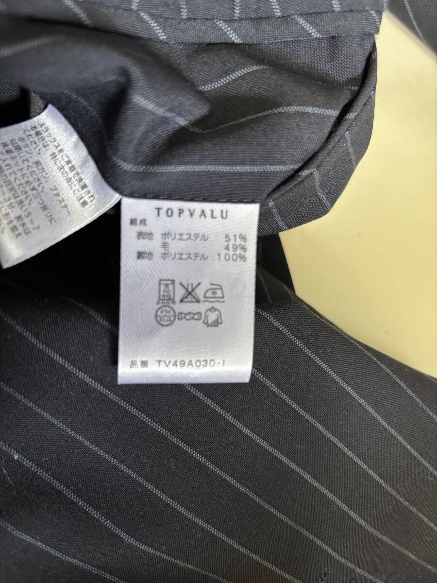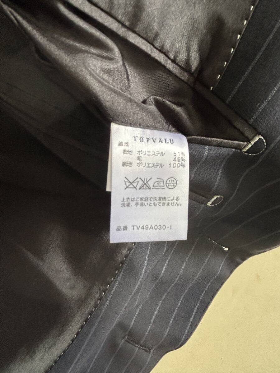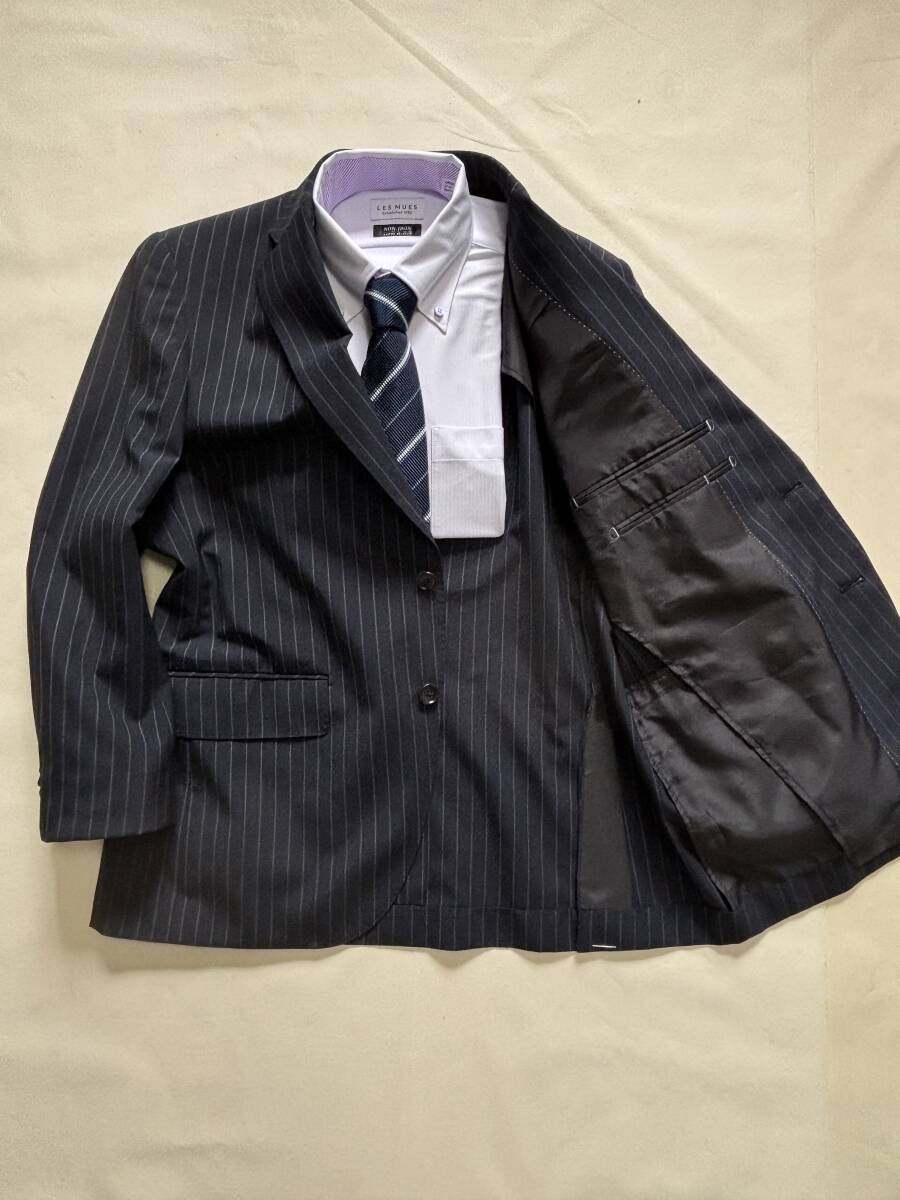 ■ 特徴:濃紺のビジネススーツ。ストライプ入り。ジャケットは背抜き,前2つボタン,サイドベンツ。パンツはノータック,ストレートライン。春夏秋用。パンツのみ家庭でお洗濯が可能
